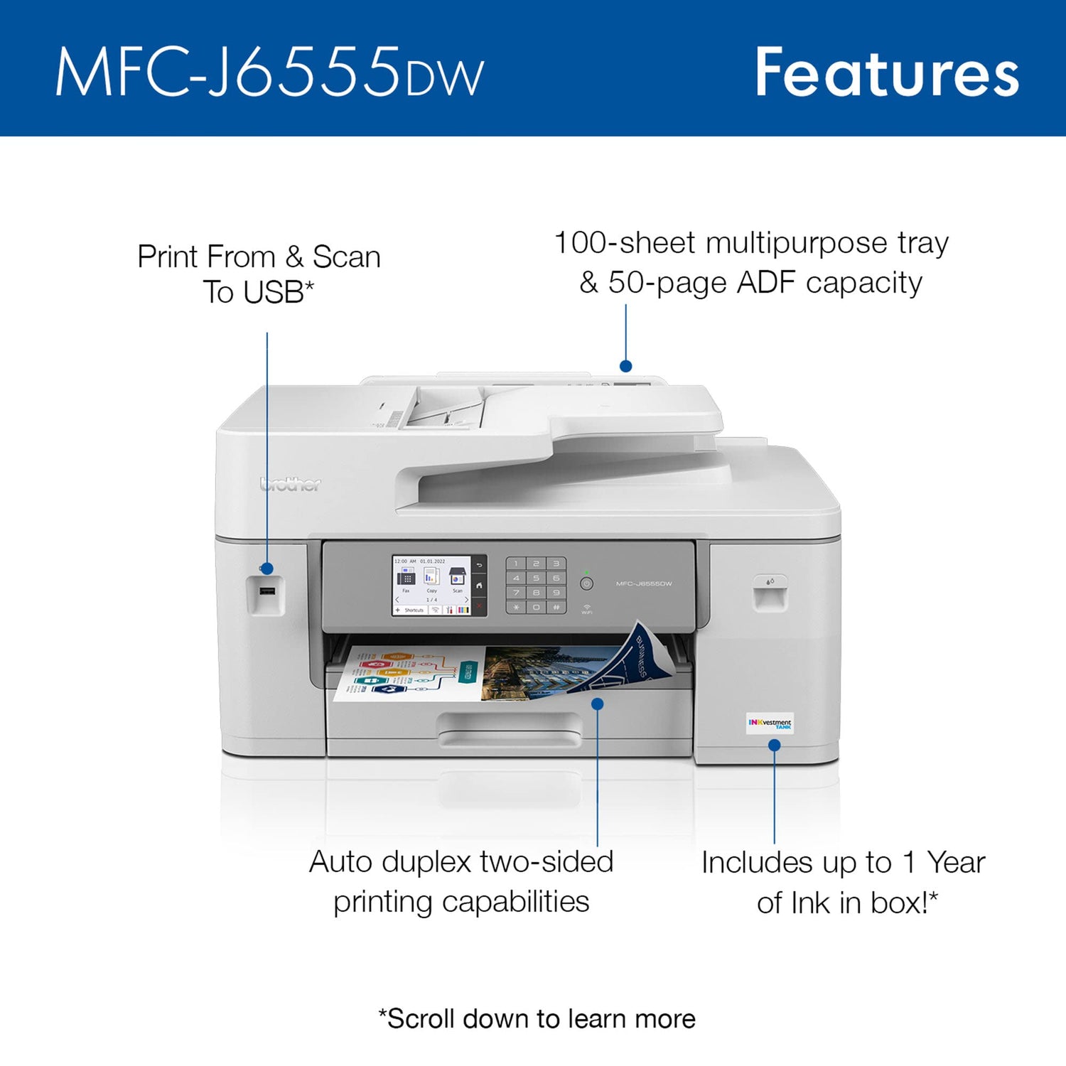 Brother MFC-J6555DW INKvestment Tank Color Inkjet All-in-One Printer with up to 1 Year of Ink in-box1 and 11” x 17” Print, Copy, scan, and fax Capabilities,White