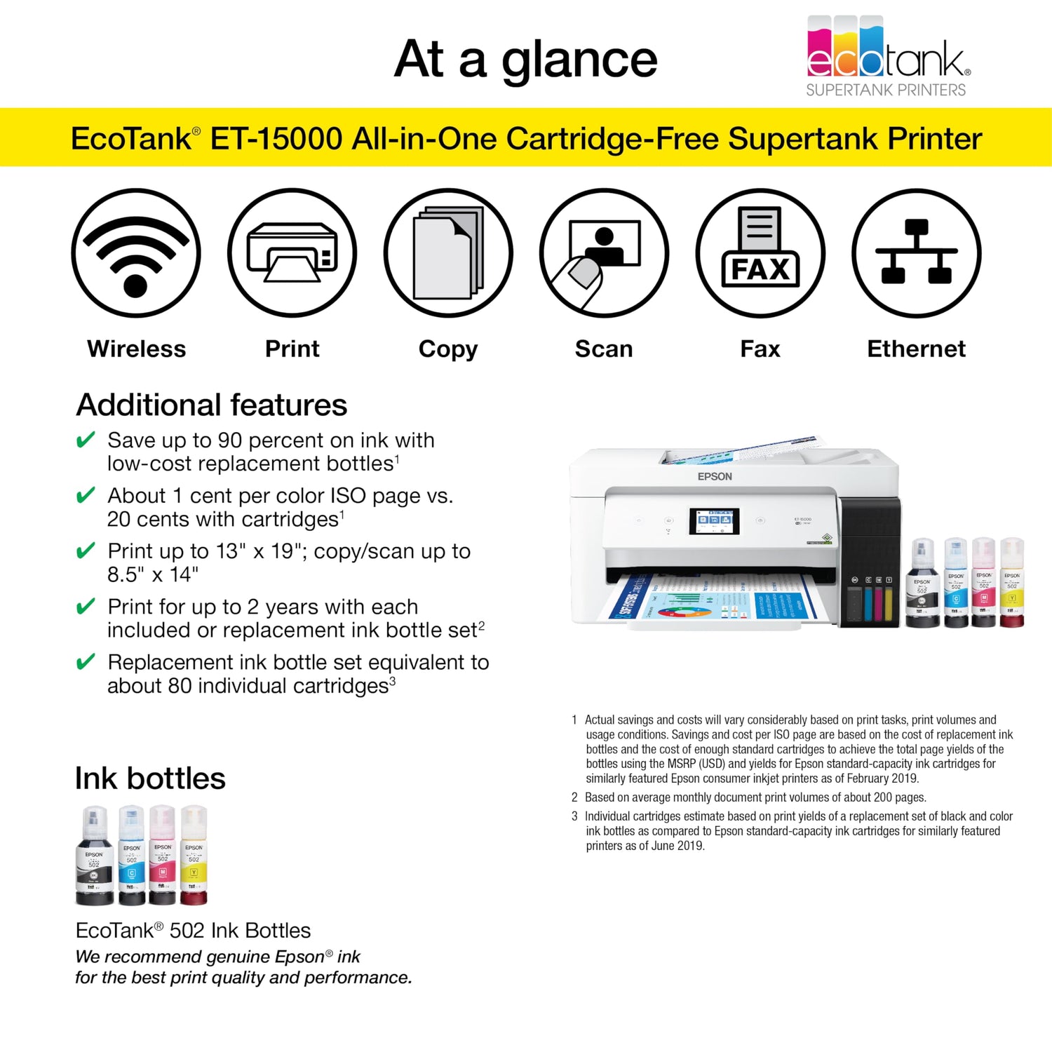 Details: The EcoTank ET-15000 wireless all-in-one offers Cartridge-Free Printing with easy-to-fill supersized ink tanks. Save up to 90 percent on ink with low-cost replacement bottles — as little as 1 cent per color ISO page vs. 20 cents with ink cartridges (1). This all-in-one delivers vibrant prints up to 13" x 19" (through rear-feed tray) and scans up to 8. 5" x 14" (via the ADF). Print for up to 2 years with each included or replacement ink bottle set (2) — each replacement set includes enough ink to print up to 6, 000 pages (3). That’s equivalent to about 80 individual cartridges (4). And, there’s zero cartridge waste. The ET-15000 features a 250-sheet front tray paper capacity and rear specialty-paper feed, plus a 2. 7" color touchscreen and hands-free voice-activated printing (5). *The NPD Group, , Total Channel Tracking Service, U. S. & Canada, Inkjet SF/MF Printers, Refillable ink tank included, based on units, February 2019 - January 2020. Supertank printers are defined as refillable ink tank printers. 1. Actual savings and costs will vary considerably based on print tasks, print volumes and usage conditions. Savings and cost per ISO page are based on the cost of replacement ink bottles and the cost of enough standard cartridges to achieve the total page yields of the bottles using the MSRP (USD) and yields for Epson standard-capacity ink cartridges for similarly featured Epson consumer inkjet printers as of February 2019. 2. Based on average monthly document print volumes of about 200 pages. 3. Part of the ink from the included bottles is used for initial setup; yields are lower than those of replacement ink bottles. Replacement and included ink bottle yields based on the ISO/IEC 24712 pattern with Epson’s methodology. Actual ink yields will vary considerably for reasons including images printed, print settings, temperature and humidity. Yields may be lower when printing infrequently or predominantly with one ink color. All ink colors are used for printing and printer maintenance, and all colors must be available for printing. For more information, visit www. epson /inkinfo. 4. Individual cartridges estimate based on print yields of a replacement set of black and color ink bottles as compared to Epson standard-capacity ink cartridges for similarly featured printers as of June 2019. 5. Epson Connect account and voice-activated account registration required. See www. epson /voice for device compatibility. 6. Most features require an Internet connection to the printer, as well as an Internet- and/or email-enabled device. For a list of Epson Connect enabled printers and compatible devices and apps, visit www. epson /connect. 7. Wi-Fi CERTIFIED; level of performance subject to the range of the router being used. Wi-Fi Direct may require printer software. 8. 12 months of standard limited or 50, 000 plain paper sheets (whichever happens first). For an additional 12-month extended service plan (total of 24 months or 50, 000 plain paper sheets, whichever happens first), register your product and use Epson genuine ink bottles. See Limited for details. 9. For convenient and reasonable recycling options, visit www. epson /recycle. 10. SmartWay is an innovative partnership of the U. S. Environmental Protection Agency that reduces greenhouse gases and other air pollutants and improves fuel efficiency.