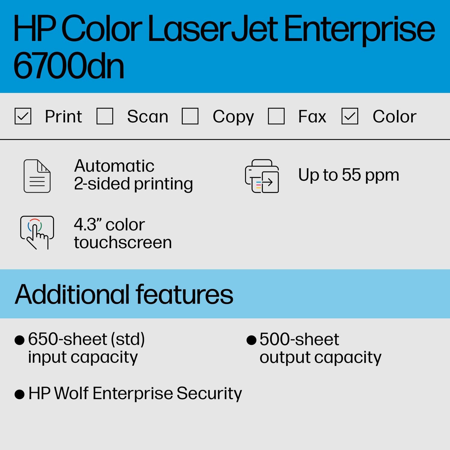 Details: The HP Color LaserJet Enterprise 6700dn Printer is a smart, connected laser printer that makes printing seamless for your whole team with its high capacity and wireless connectivity. Create everyday color documents at a low cost.