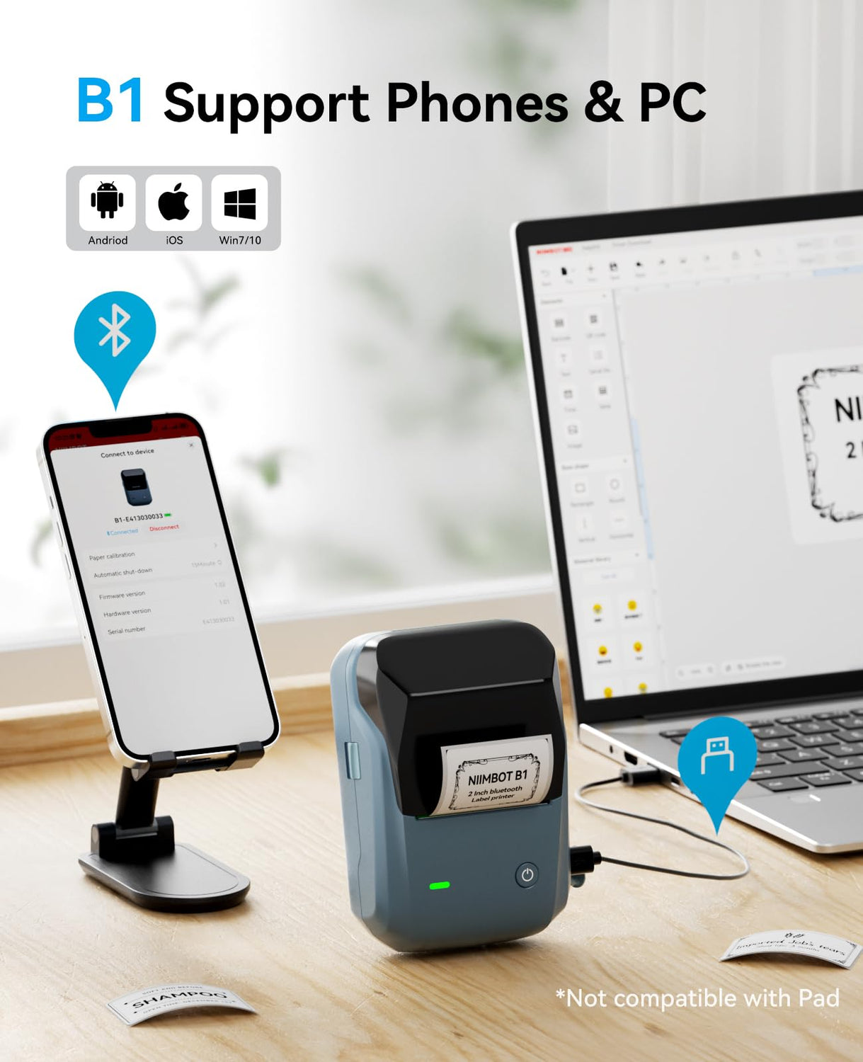 - 【Easy to Use】The B1 bluetooth label printer support iOS, Android. Download the "NIIMBOT"app, select the printer model B1 from the app, and connect printer. USB cable connection for PC, need to download driver form Niimbot brand official website, please see the details page video description.