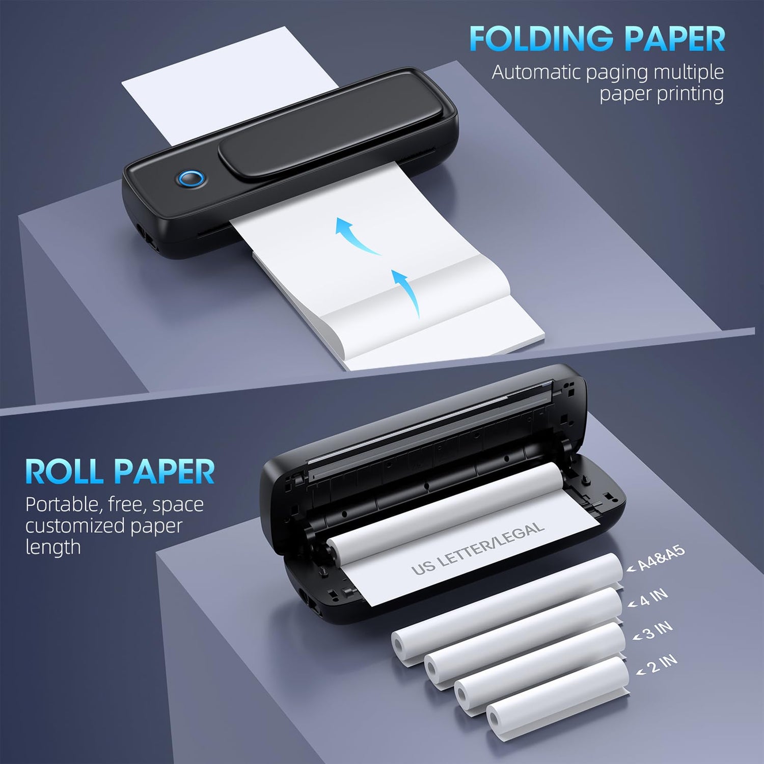 - Portable Printer-Multiple sizes in one The printer can support two paper types, roll paper and folded thermal paper, and can also support multiple thermal paper sizes, such as US Letter&Legal, A4&A5, 2&3&4in (width 216/216/210/210/107/77/ 57mm), can meet most of your needs.