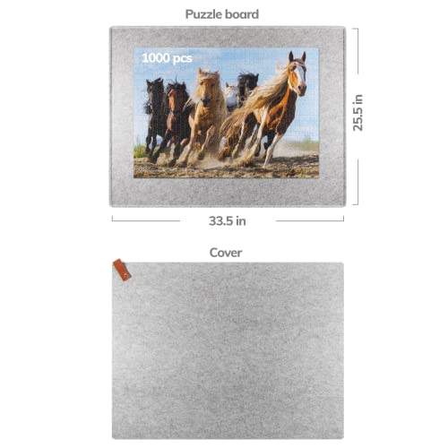 - PERFECT SIZE FOR 1000 PIECES PUZZLE : Our jigsaw board with cover is sized 33.5 " x 25.5" to fit 1000 piece puzzles. Cozy felt cover helps protect your puzzle pieces when not in use and has a handle for easy opening.