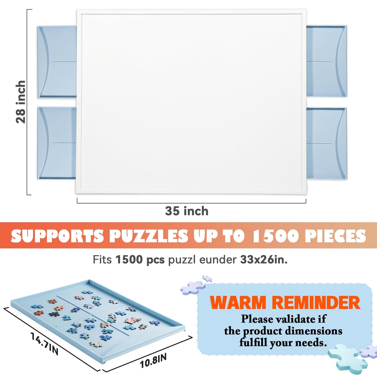 - 1500-Piece Puzzle Platform With Four Sorting Bins For Easy Organization:Our 35"x28" puzzle board is designed for up to 1500 pieces, ideal for larger jigsaws. It includes 4 sliding drawers to organize pieces by color or section, improving your puzzle-solving efficiency.