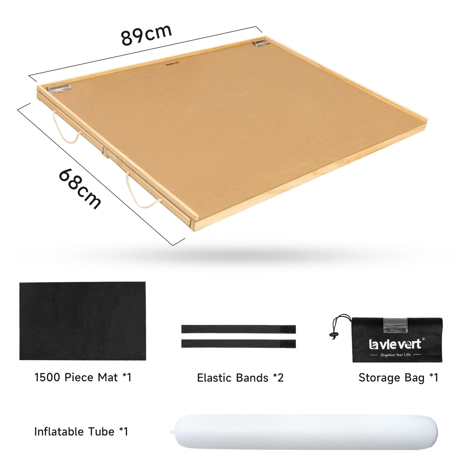 - Jigsaw Puzzle Board with Cover- A 1,500pc felt mat, 2 elastic bands, an inflatable tube and a drawstring storage bag are enclosed. These accessories can either go with the puzzle table, or store an extra puzzle game.