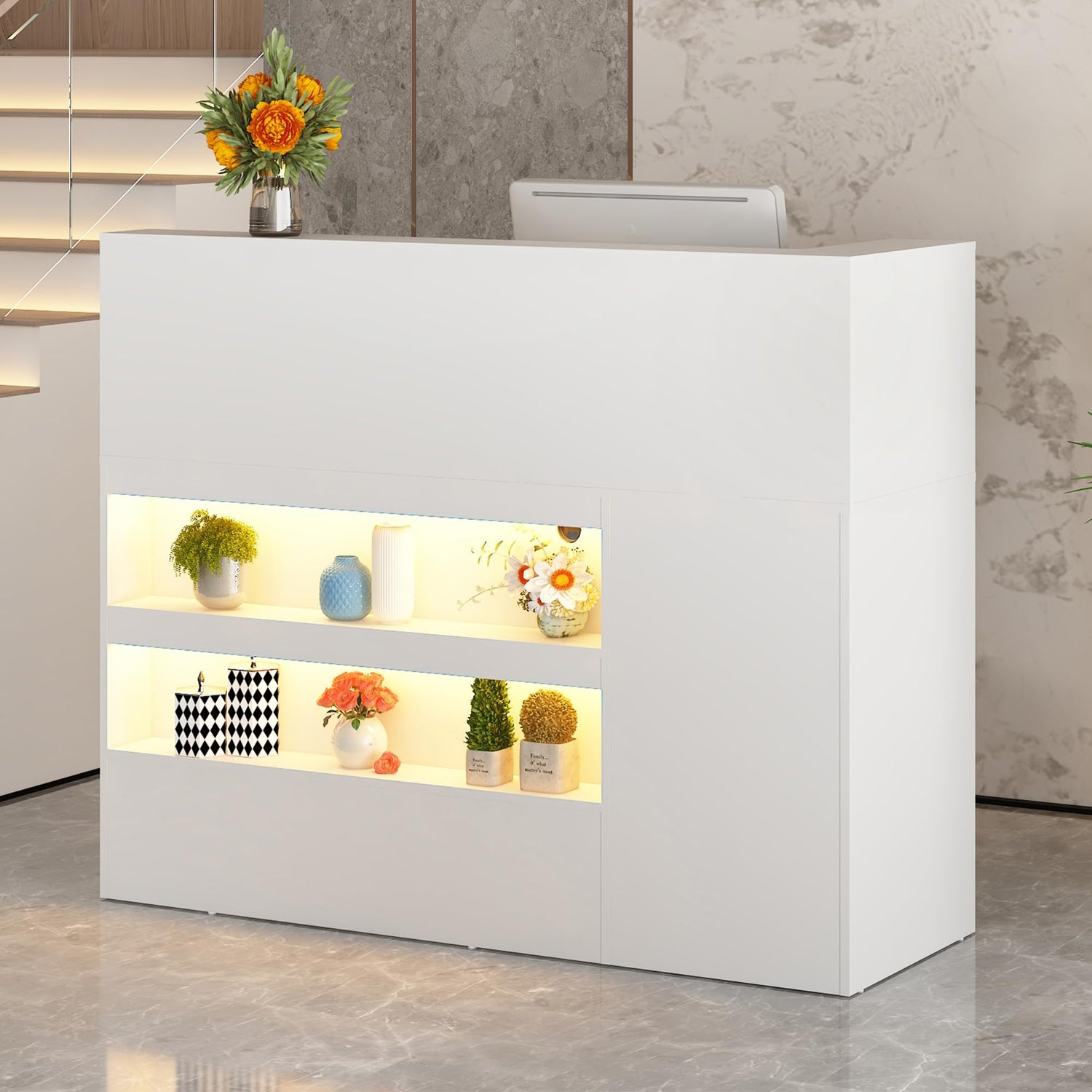 - Multipurpose function: Measuring 19.7"D x 55"W x 29.7 "H, this checkout counter with LED light bar complements modern interiors and is ideal for office receptions, office computer desks, salons, retail outlets, salon retail counters, restaurant fronts, or home workspaces, making it a reception versatile choice for reception areas and showrooms