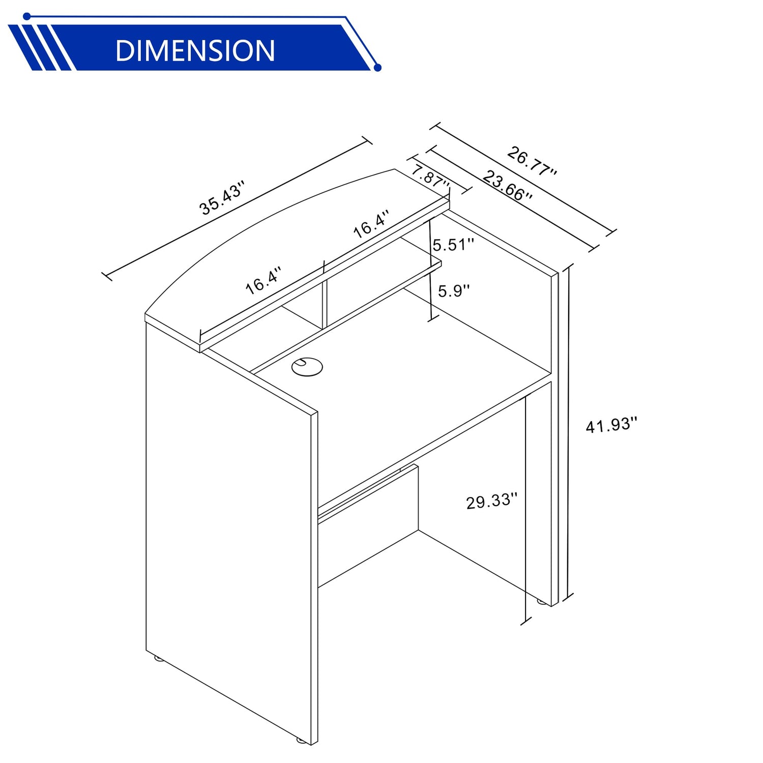 - Robust Construction: Crafted from high-density artificial board, this reception desk boasts a substantial 1-inch thickness, ensuring not only durability but also unwavering stability. This wooden reception desk which is perfect for working and writing, the hutch top can store often used files or stationary. Overall size: 41.93'' H X 35.43'' W X 26.77'' D.
