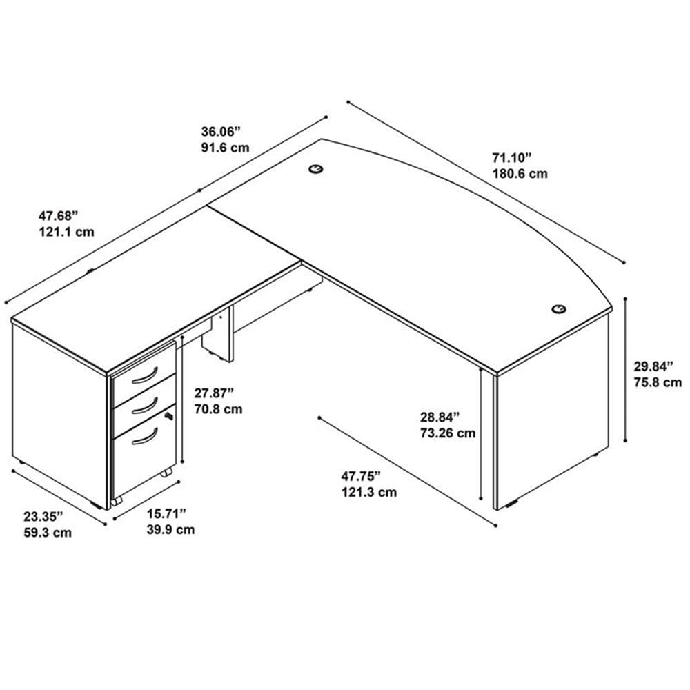 Details: Enjoy convenient features, wide work surfaces and commercial quality with this Bush Business Furniture Series C Bow Front L Shaped Desk. Clean lines, extended modesty panels and Brushed Nickel hardware define the professional look of Series C, while a sturdy construction and thermally fused laminate finish provide years of reliability. Integrated wire management grommets control your cables, and an inviting Bow Front Desk design gives guests the added space they need to pull up chairs for a meeting. Roll the Mobile File Cabinet under the space-saving L Shaped Desk or move it wherever you need your supplies and paperwork. The options are endless with Series C. This affordable office furniture boasts quality craftsmanship to withstand the rigors of a 40-plus hour work week. Seven stylish finishes blend seamlessly in any environment. Multiple layout options meet the needs of numerous workspaces, from the private or home office to reception areas and conference rooms. Series C evolves with your preferences, allowing you to reconfigure your workspace as required with a complete line of coordinated commercial office furniture. American made with U.S. and imported parts.