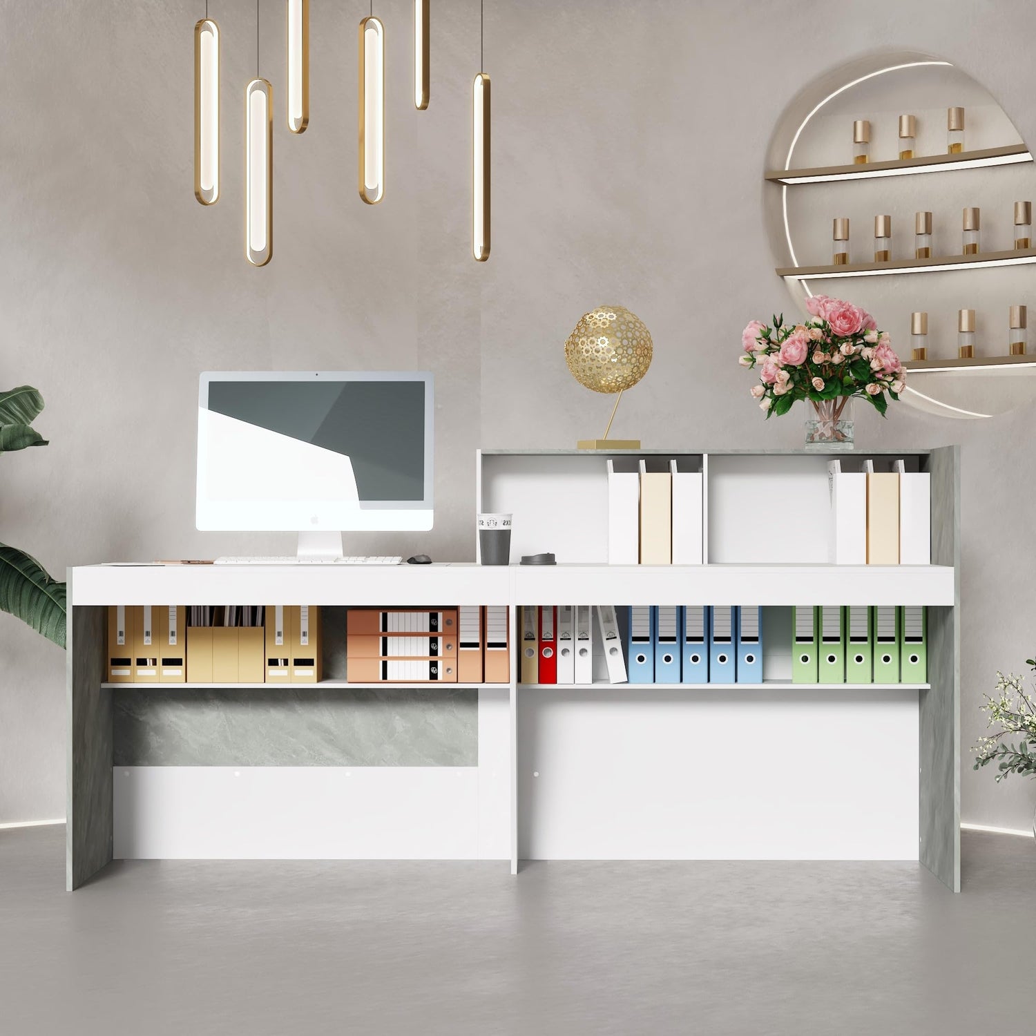 - [Durable Construction] Crafted from P2 grade particle board, this office reception desk is built to last. The sturdy construction ensures stability and durability, making it a reliable choice for high-traffic areas. The desk is designed to withstand daily use while maintaining its elegant appearance.