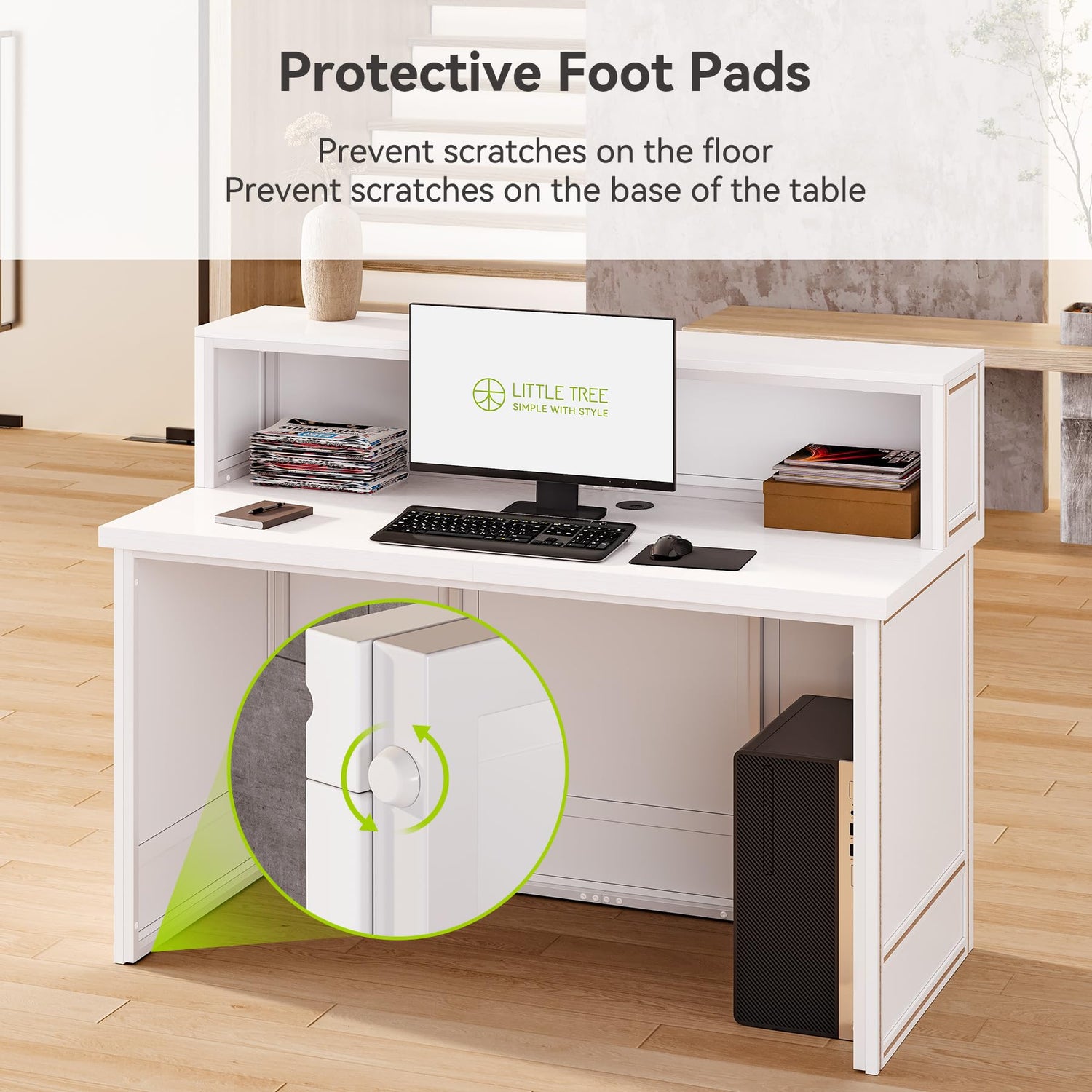 • Wide Desktop: The desktop size of this reception desk is 23.62" W x 56.69" L. The spacious desktop can place various items such as monitors, office documents and office tools