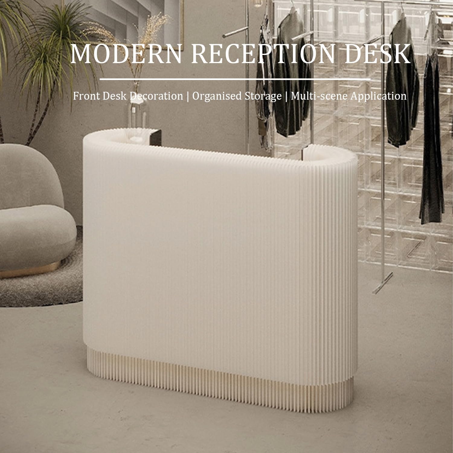 Details: This reception desk can be folded design, folded thickness of only 7CM, unfold the overall appearance of fashionable and versatile, stable structure can be used with confidence. The small reception desk has double storage and can be moved at will. The reception desk is made of environmentally friendly material, recyclable, very suitable for business offices, exhibitions, hotel halls and other places.