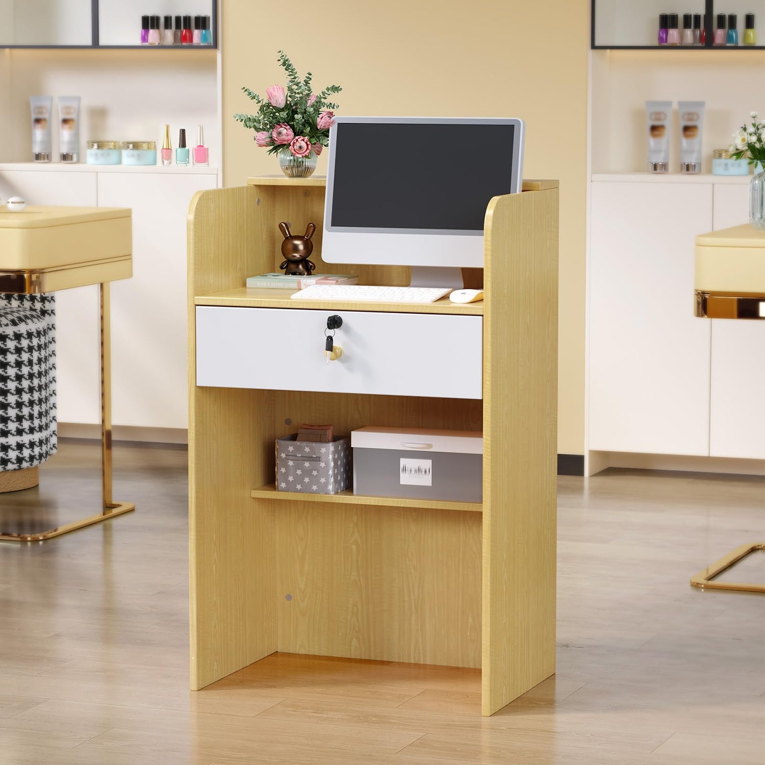 OmySalon Reception Desk with Counter, Small Front Desk w/Lockable Drawer, Wooden Modern Reception Table for Salon Lobby Office Home (Original Wood, 24)