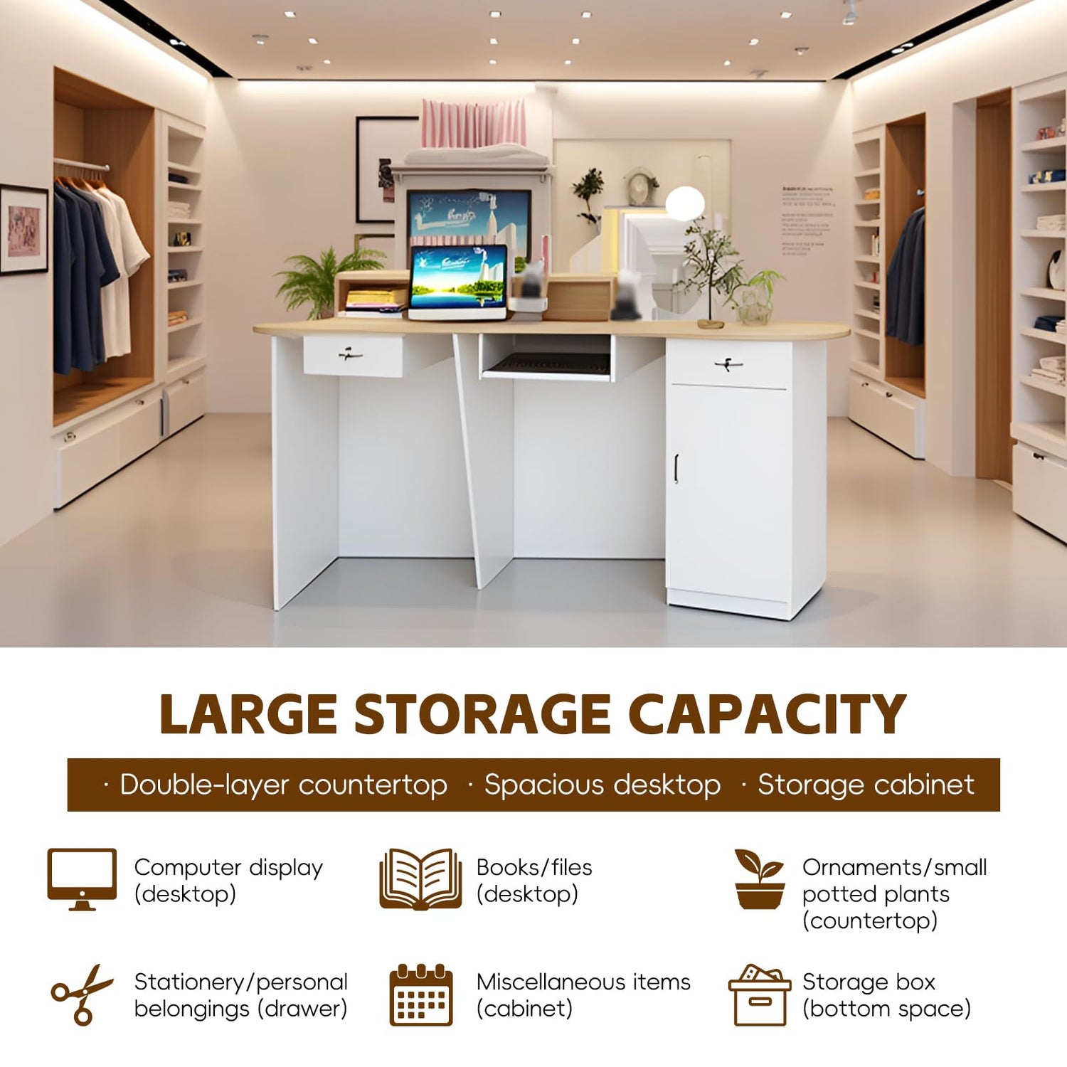 - Heavy-Duty Solid Wood Construction: Built with scratch-resistant, waterproof solid wood and reinforced panels, this reception desk guarantees exceptional durability and weight-bearing capacity for daily use.