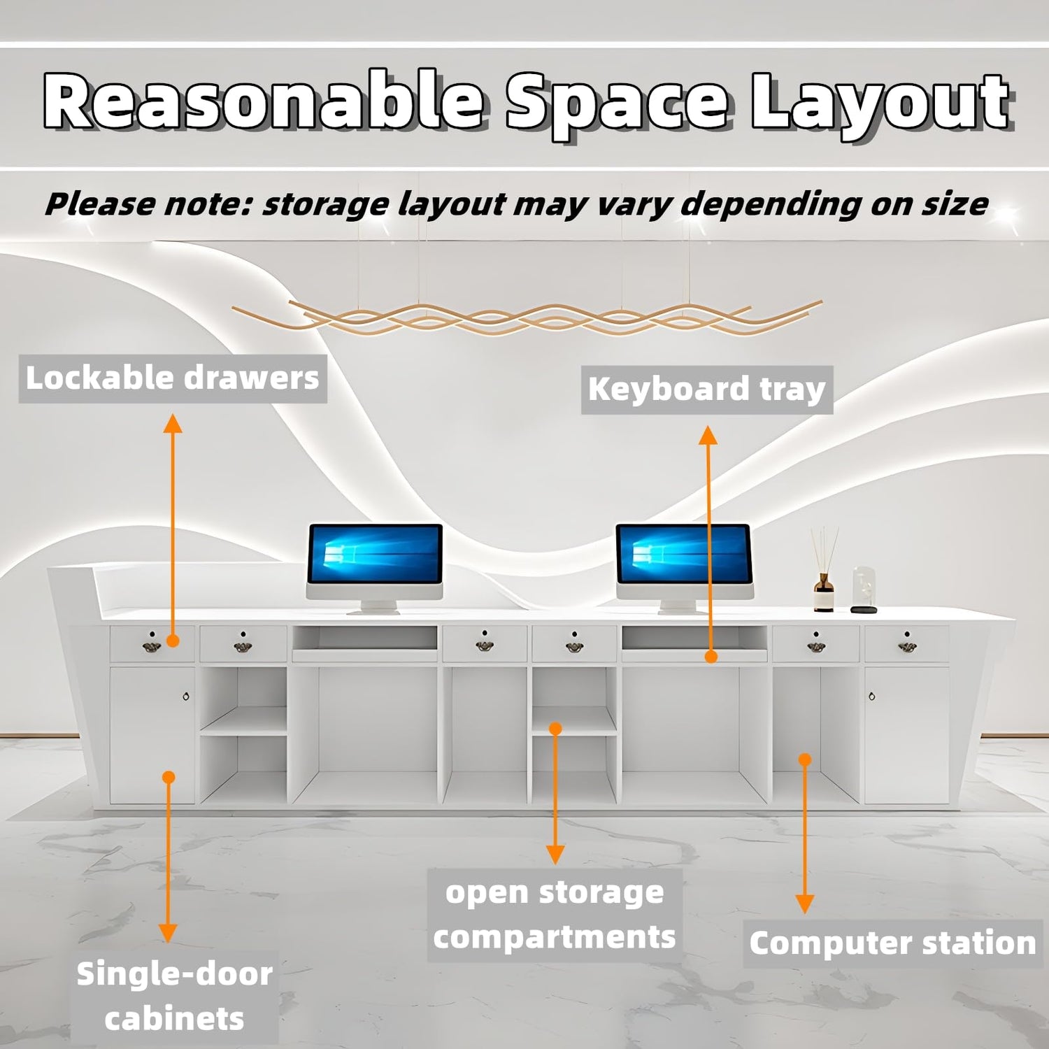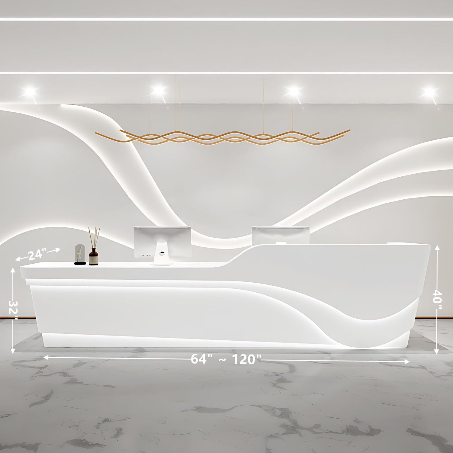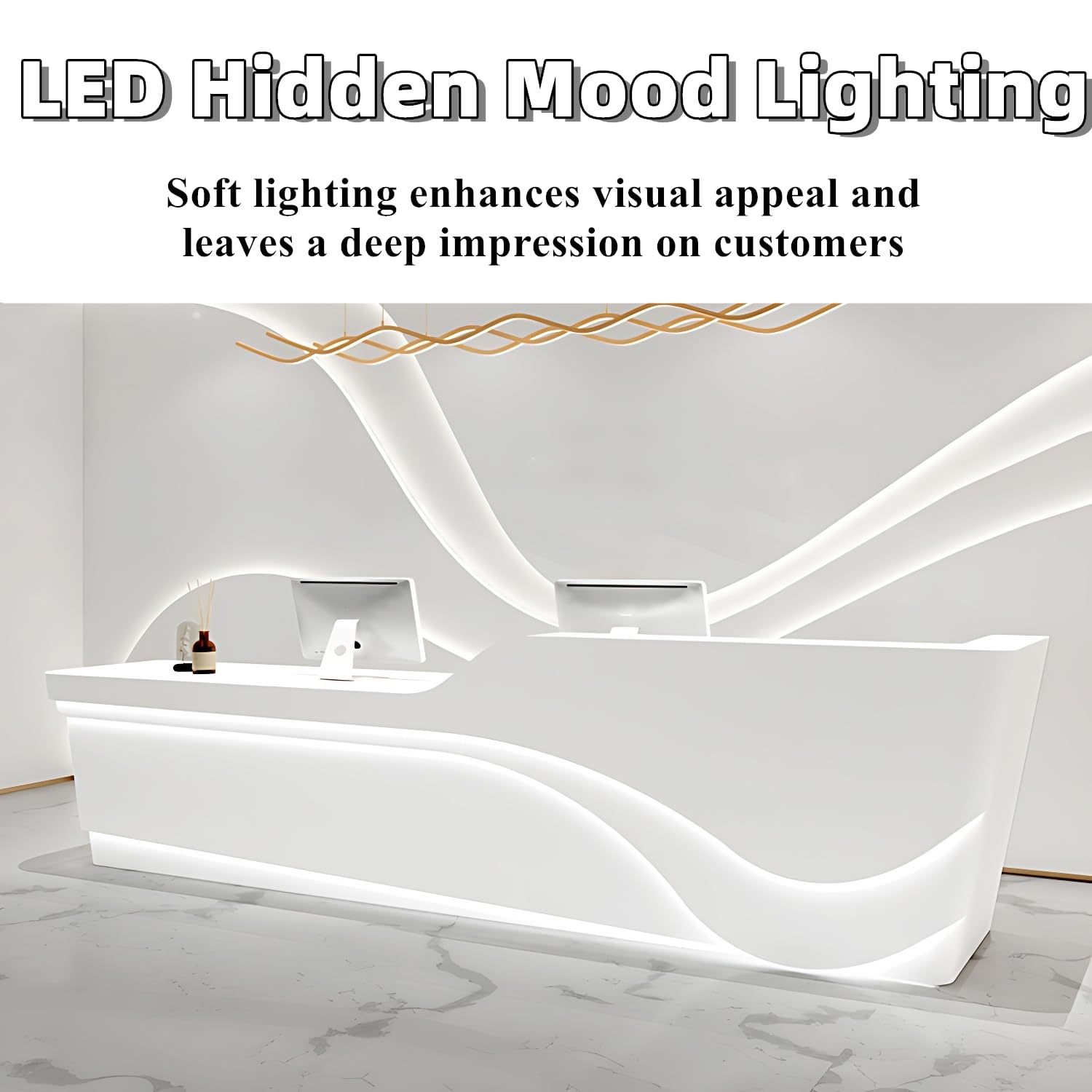 - Hidden LED Lighting for Visual Appeal: Elevate your space with a front desk reception counter featuring hidden LED lighting that adds a soft, welcoming glow, ideal for creating a stunning first impression in your reception table area.