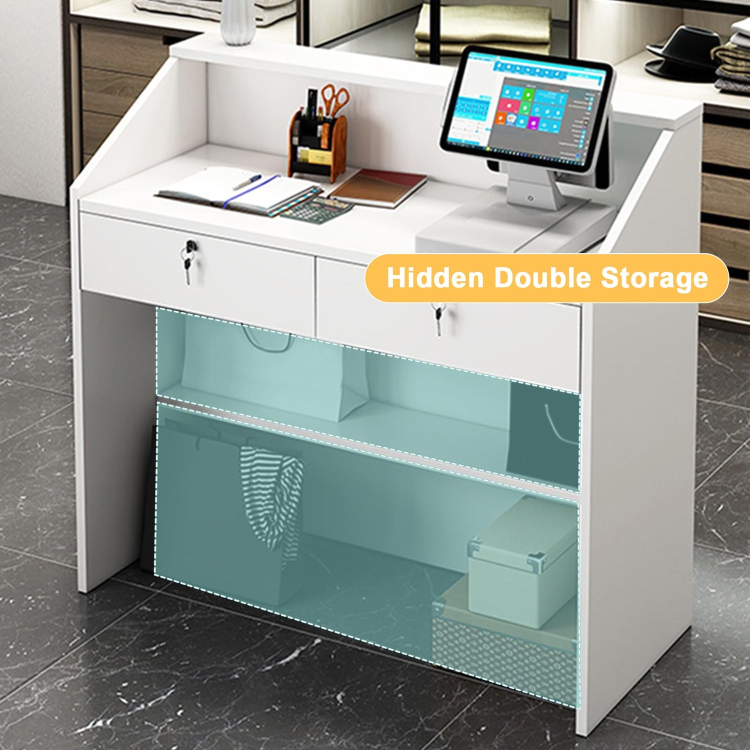 - ✔ 【POWERFUL WORKSPACE】Our reception desk with Double countertop offering excellent room for your computer, files, papers, brush pot, cash registe to keep your work essentials organized.