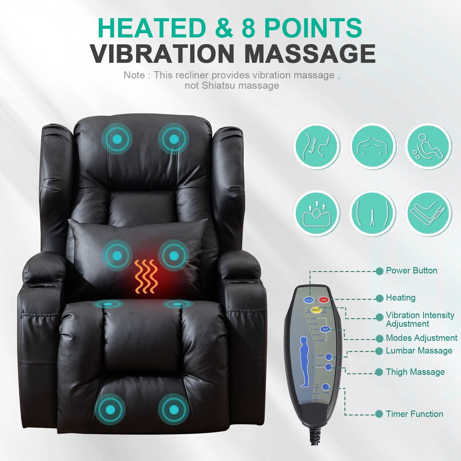 - Heating and Vibrating Massage: Our power massage recliner chair is equipped with a convenient remote control and an invigorating 8-point vibrating massage system. The massage function helps alleviate discomfort in the neck, back, thighs, and waist