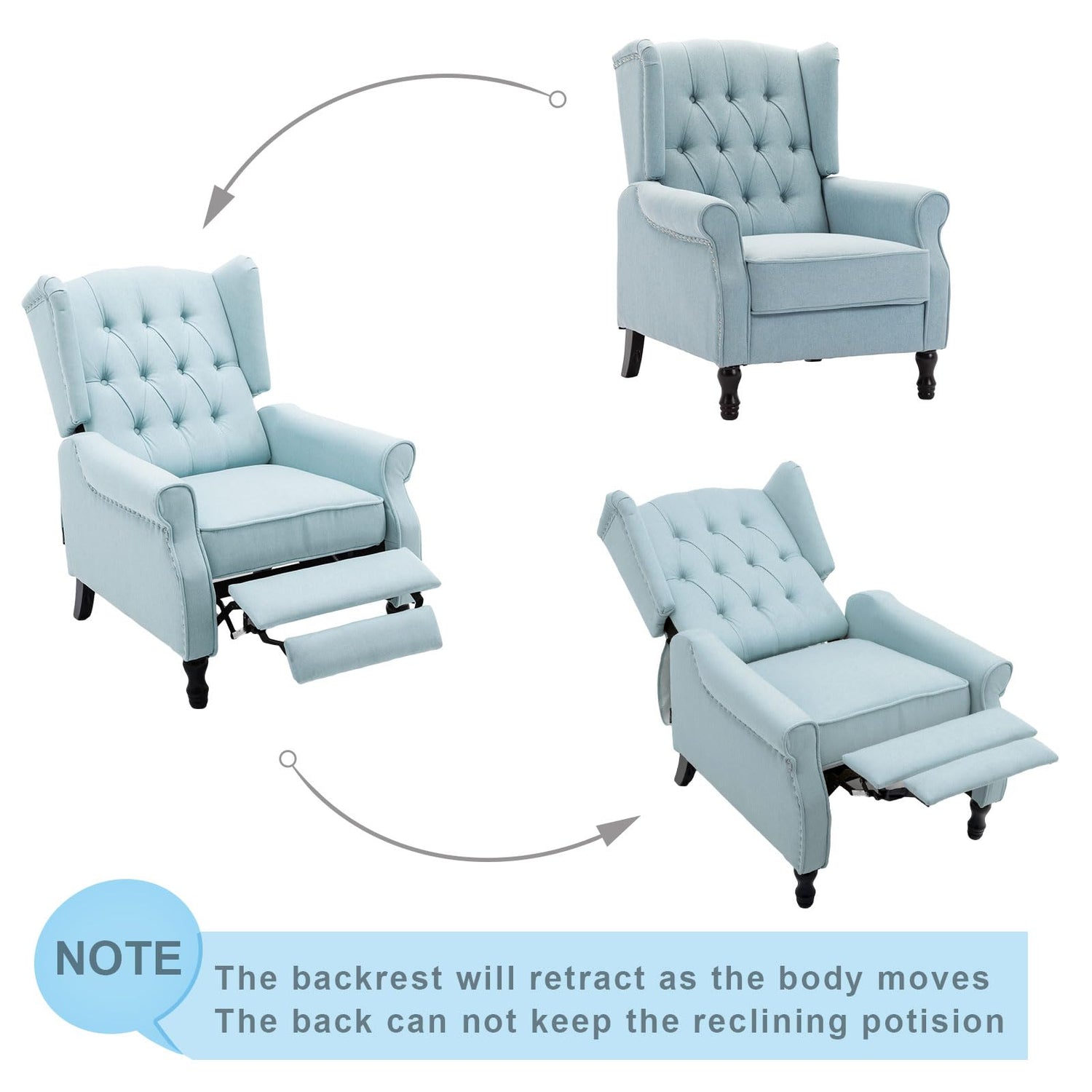 Altrobene Pushback Recliner, Modern Accent Arm Reclining Sofa, Fabric Wingback Chair for Living Room & Bedroom, Light Blue