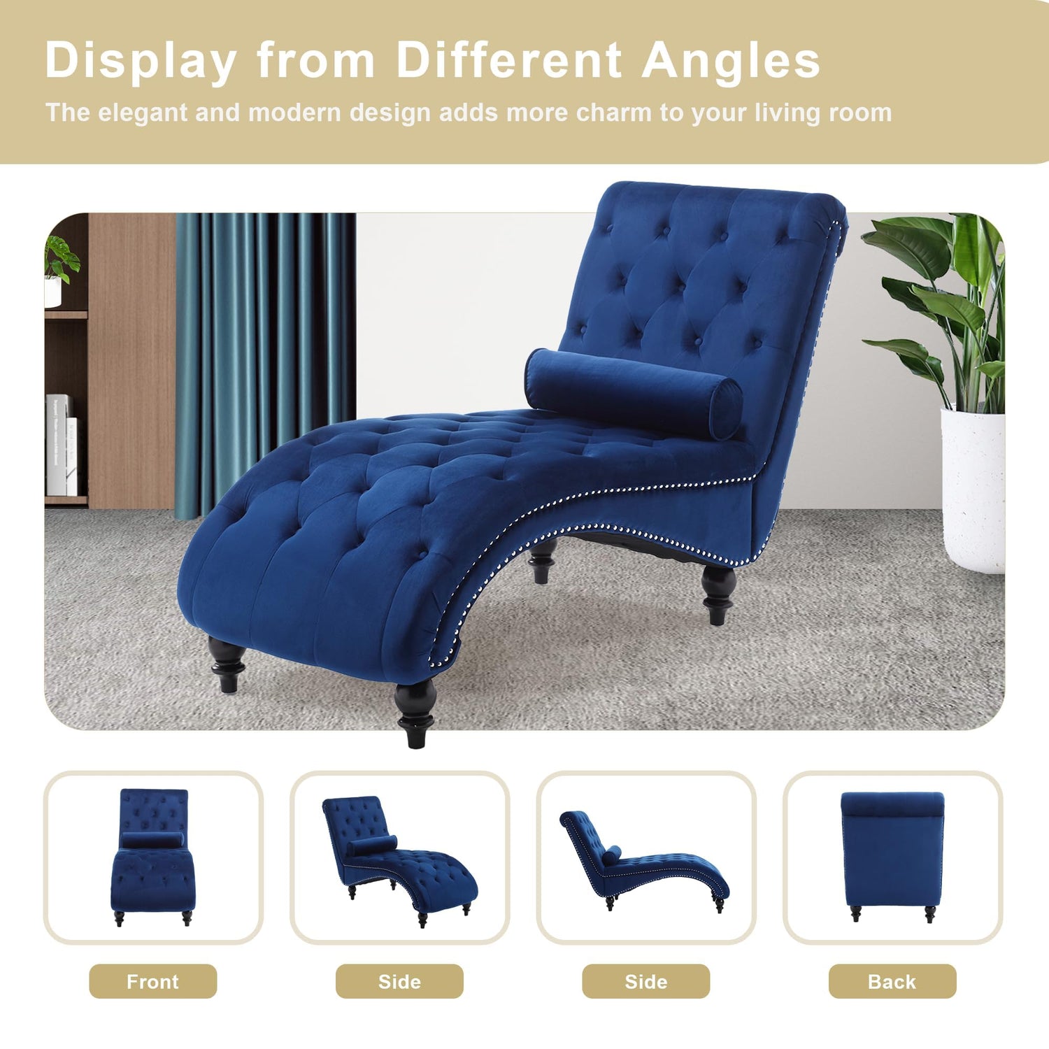 binzida Velvet Chaise Lounge Indoor,Button-Tufted Upholstered Chaise Lounge Chair with Pillow for Bedroom Living Room Office Modern Backrest Leisure Recliner Sleep Sofa (Blue)