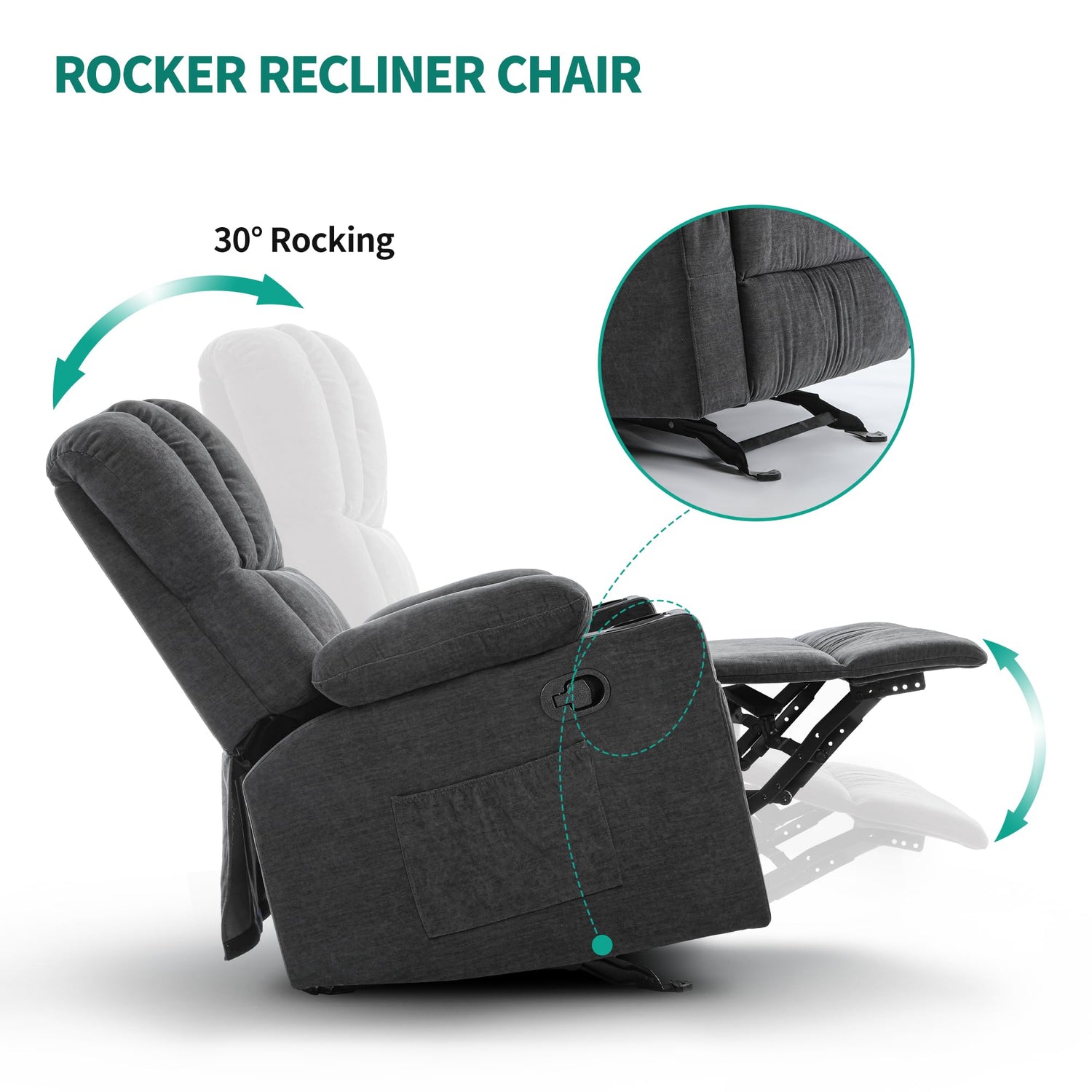 - Angle Adjustment & Rocking Recliner: This recliner chair can effortlessly lift the footrest by simply pulling the side handle, allowing you to place your hand on the armrest and safely recline it back up to 160 degrees. Also features 30° rocking function for enhanced comfort to relieve stress and fatigue,its max weight capacity is about 300lbs