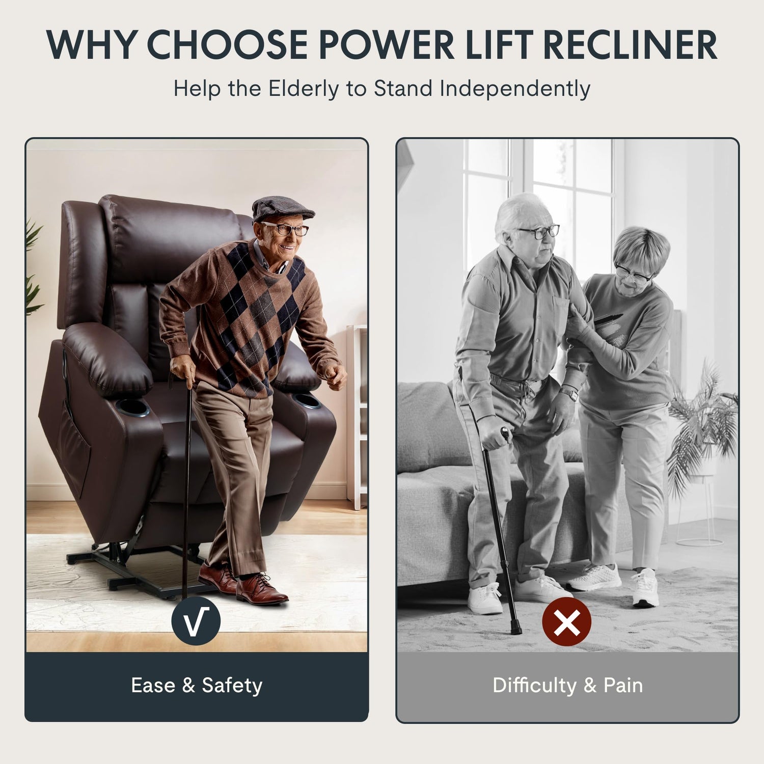 - 【Effortless Power Lift】 - Designed with seniors' comfort in mind, the FLEXISPOT Power Lift Recliner makes it easy to stand up or recline with just the press of a button. Its smooth and quiet lifting mechanism gently tilts the chair, reducing strain on your back and knees.