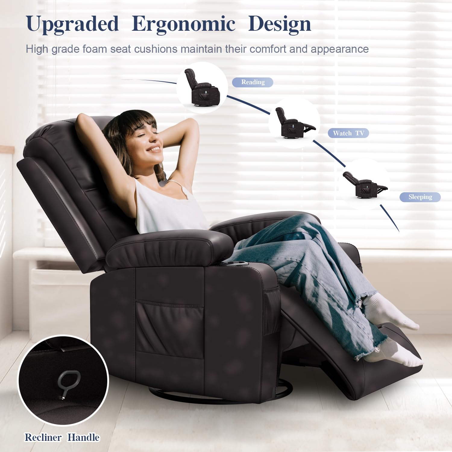FURNIMAT Recliner Chairs for Adults, Massage Rocker with Heated Modern Ergonomic Lounge 360 Degree Swivel Single Sofa Seat Living Room Lounge Recliners Brown