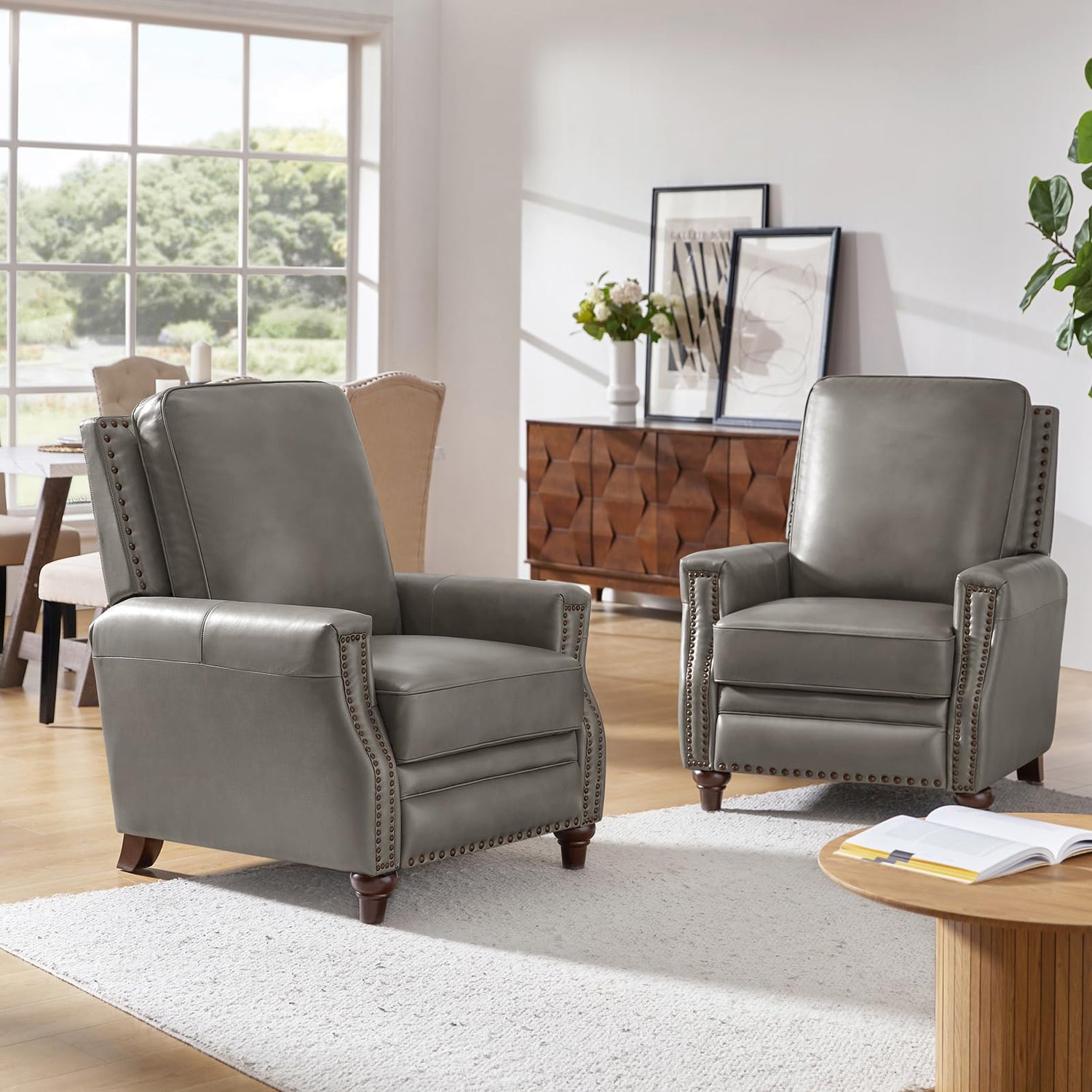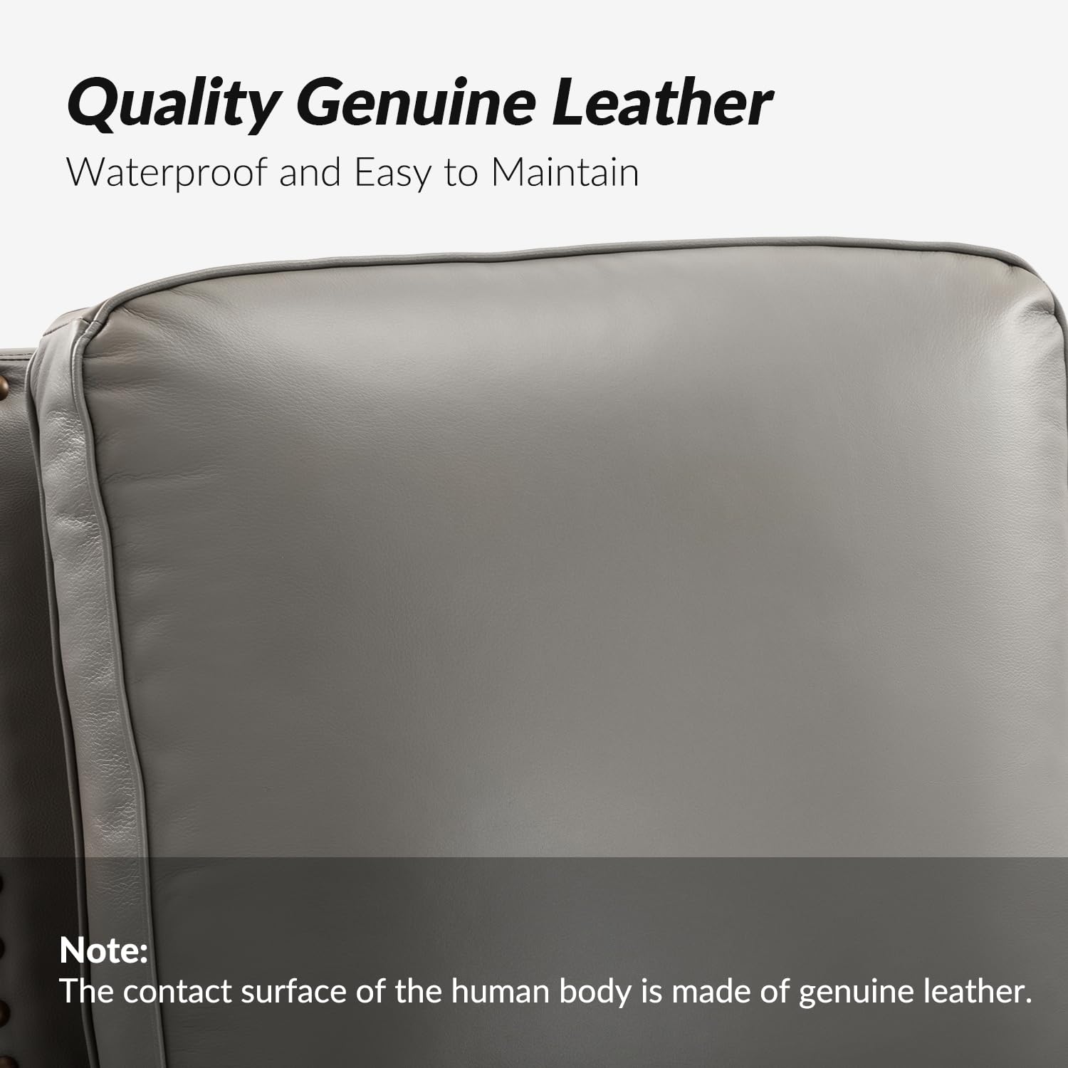 • Premium Top-Grain Leather & Modern Nailhead Accent:Handcrafted with genuine leather upholstery and vegan leather blend; Smooth finish resists stains and scratches; Classic nailhead trim outlines armrests and footrest for timeless elegance