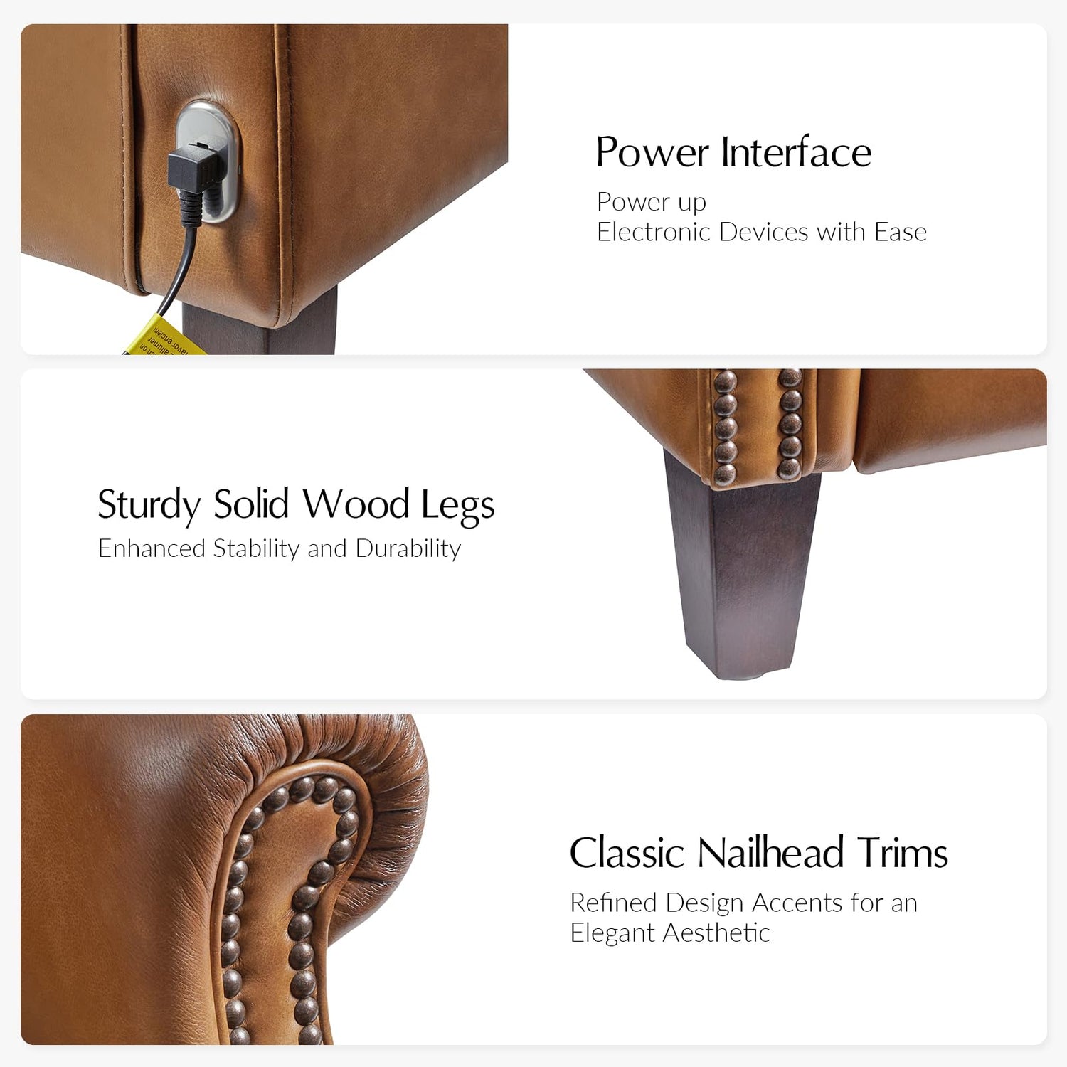 HULALA HOME Power Genuine Leather Recliner Chair with Charging, Rivet Decor Comfy Single Sofa, Solid Wood Legs, Tufted Home Theater Seating for Living Room, Camel