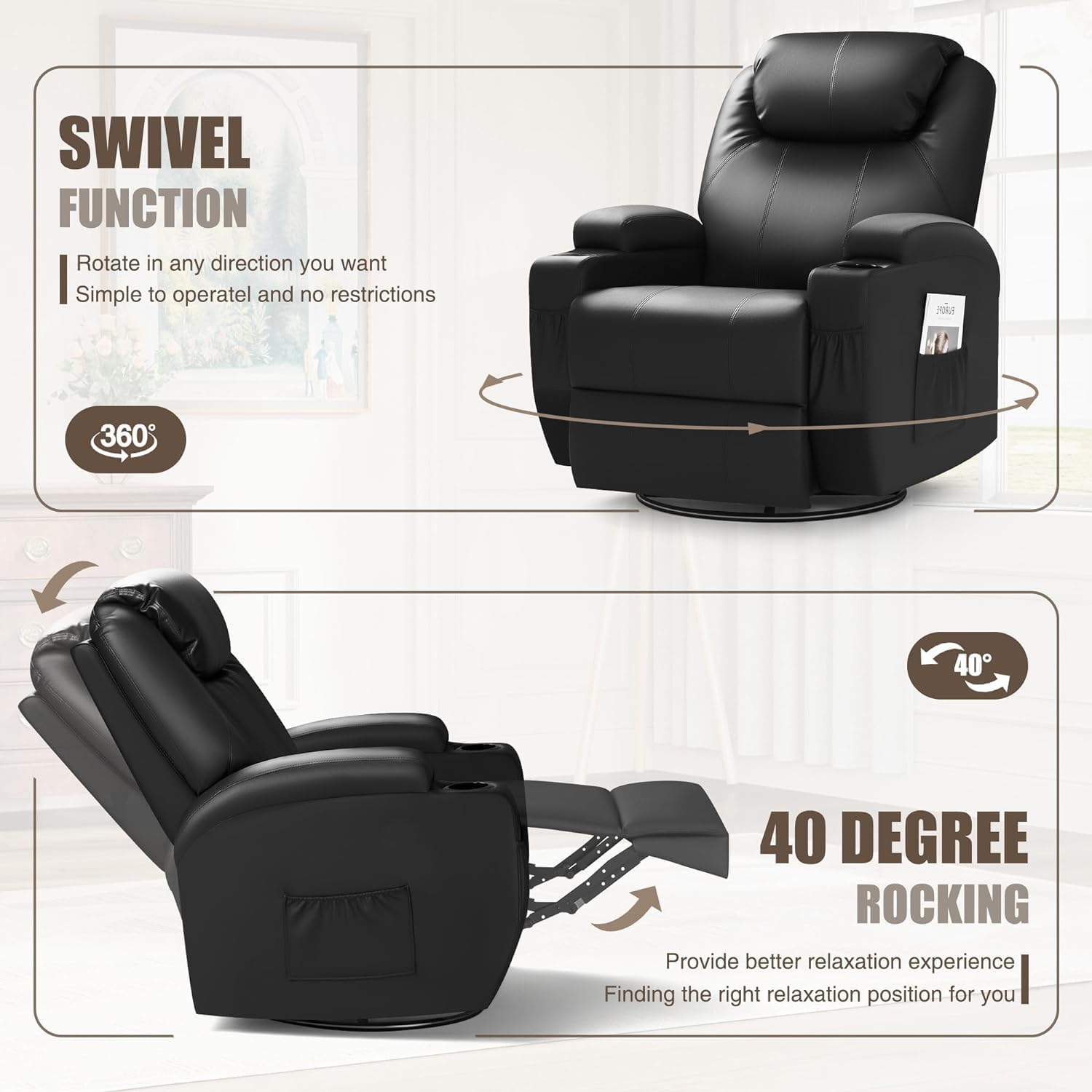 Details: Are you looking for the perfect recliner sofa for your new living room? This luxury sofa is tailored for you, 8 massage, sleep mode, swivel, rocking, recline, lying, all functions are available. Thickened headrest, thickened cushion, thickened waist cushion, all are for your comfort design. when you sit down, your body will be immersed in a soft sofa and can rocking slowly and freely to enjoy your own time.