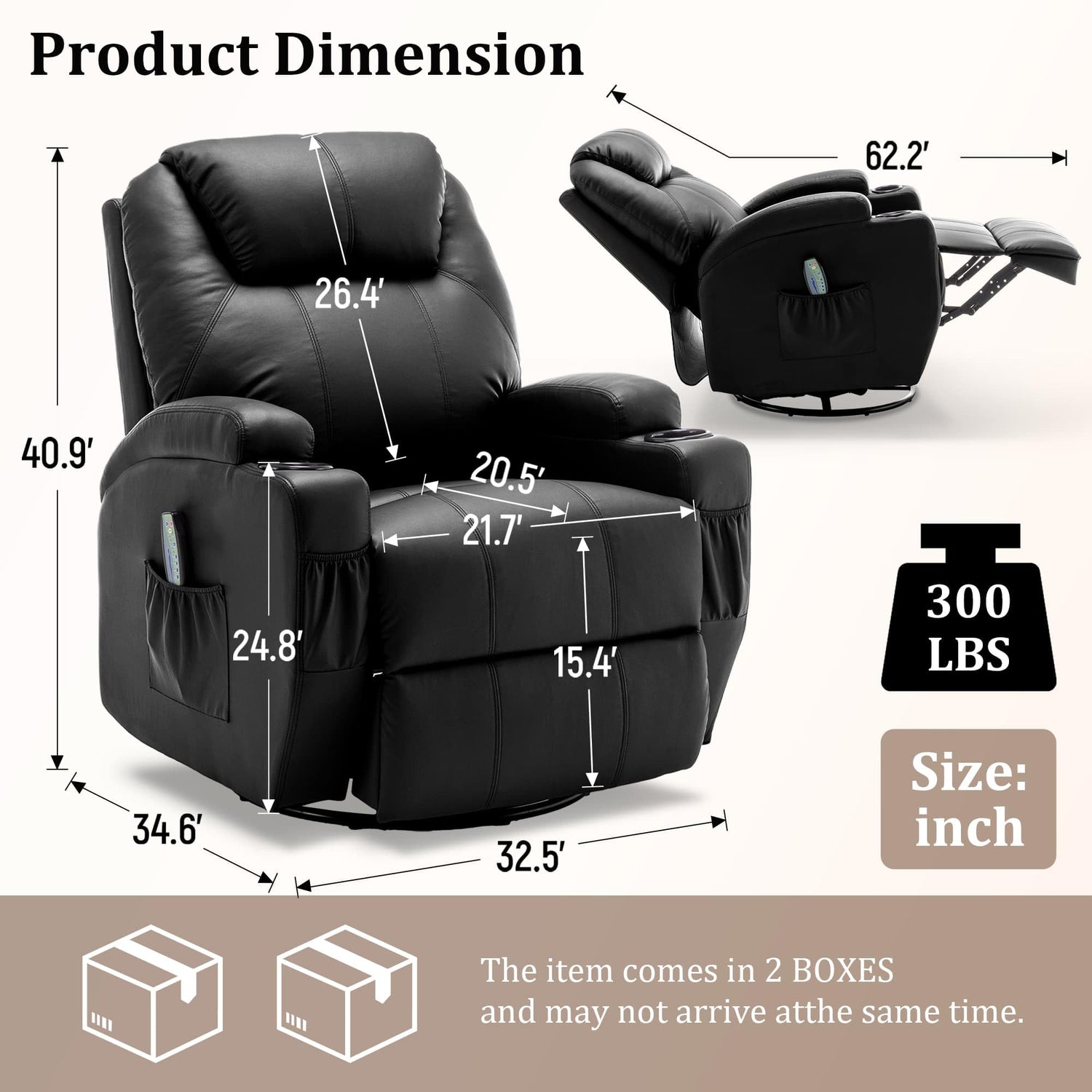 - Superior Material: The Swivel Rocker Recliner is designed with comfort and quality in mind. Made from premium faux leather, which is durable, easy to clean, and water-resistant, the recliner chairs for adult cushions are thick padded with high-density sponges that offer excellent support while sitting. The high-resilience sponges ensure the reclining chair remains comfortable over time, conforming to your body and providing a cozy seating experience.