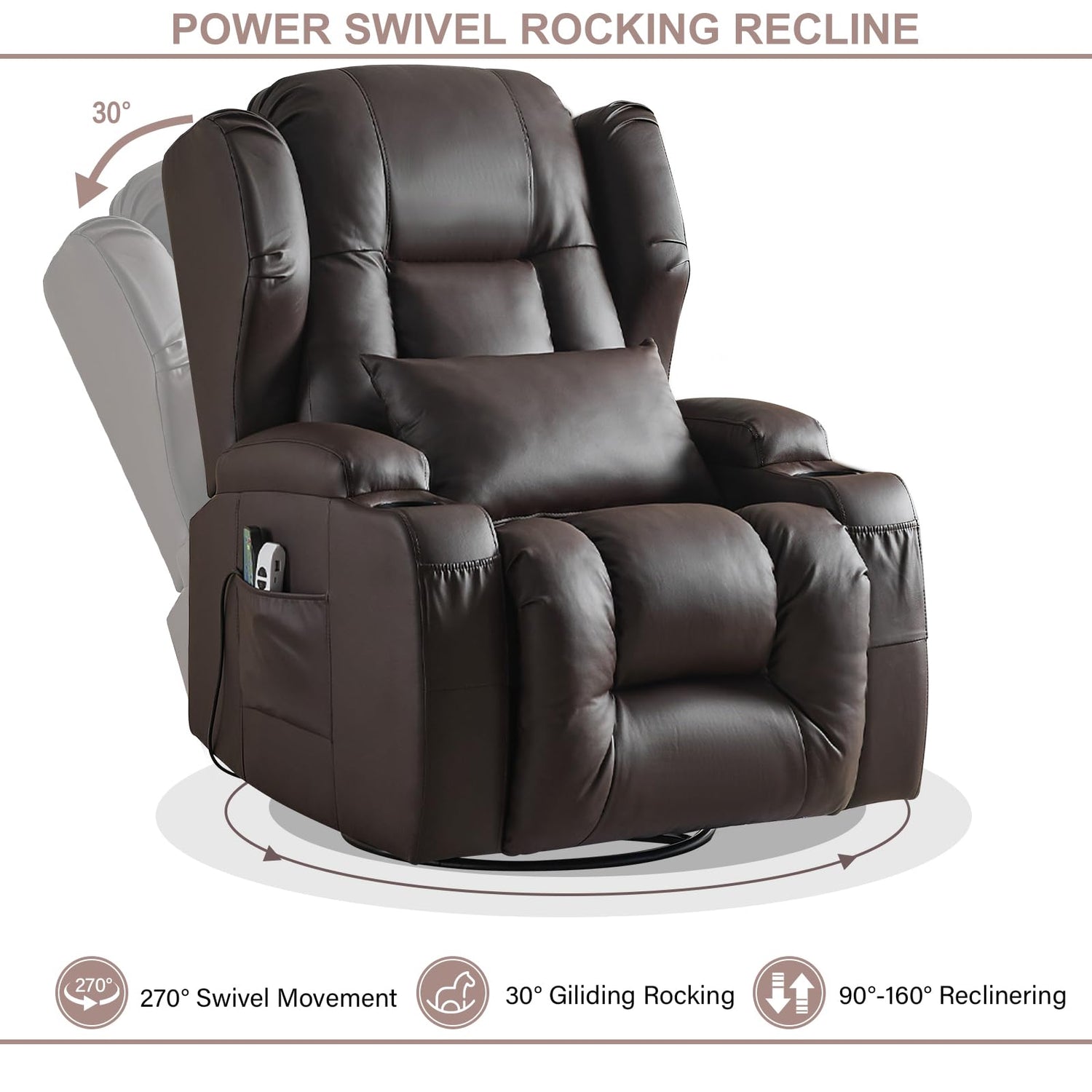 OQQOEE Power Recliner Chair,Electric Swivel Rocker Recliner,Glider Rocking Chairs Home Theater Seating with Massage Heat,Cup Holders,USB Ports for Living Room (Brown PU)