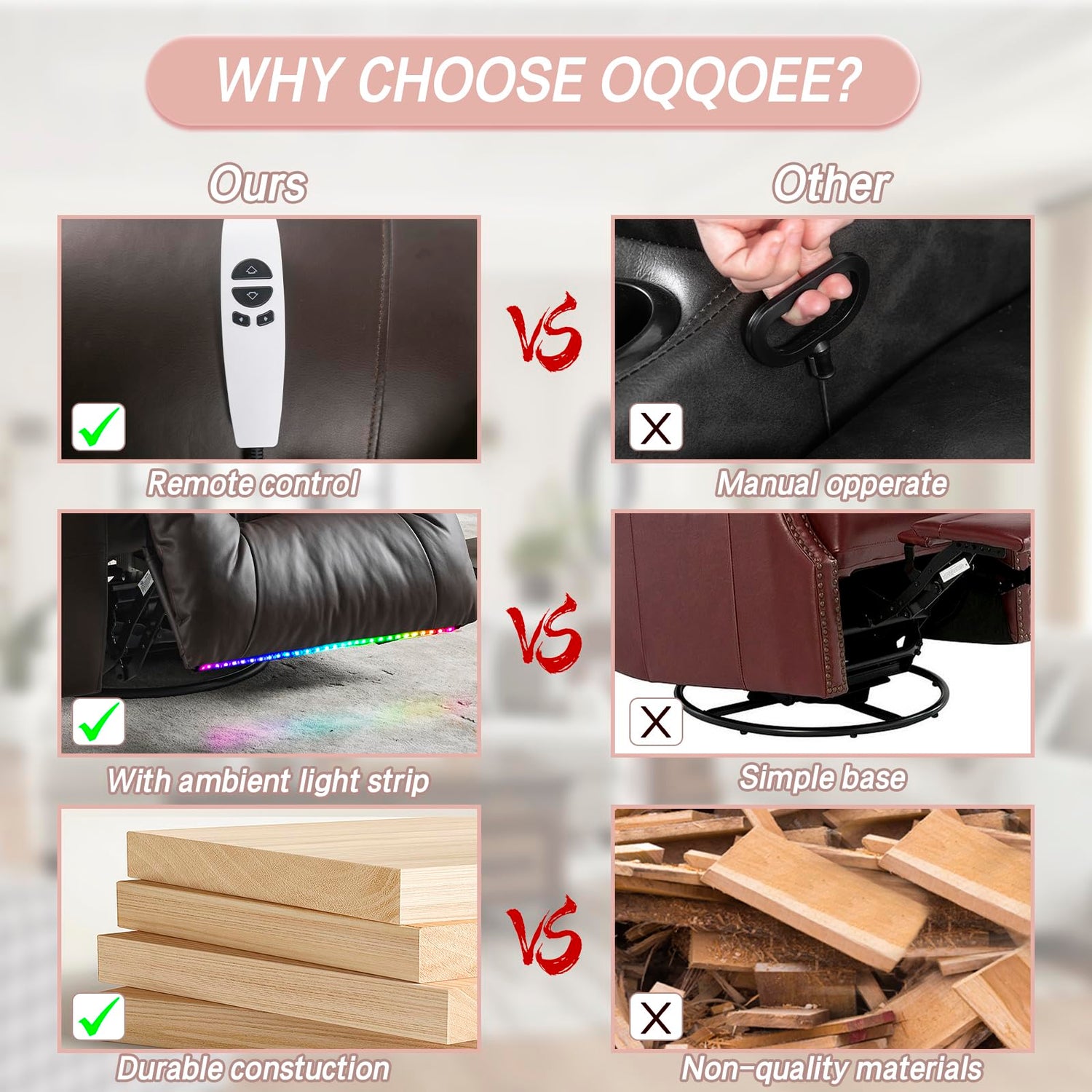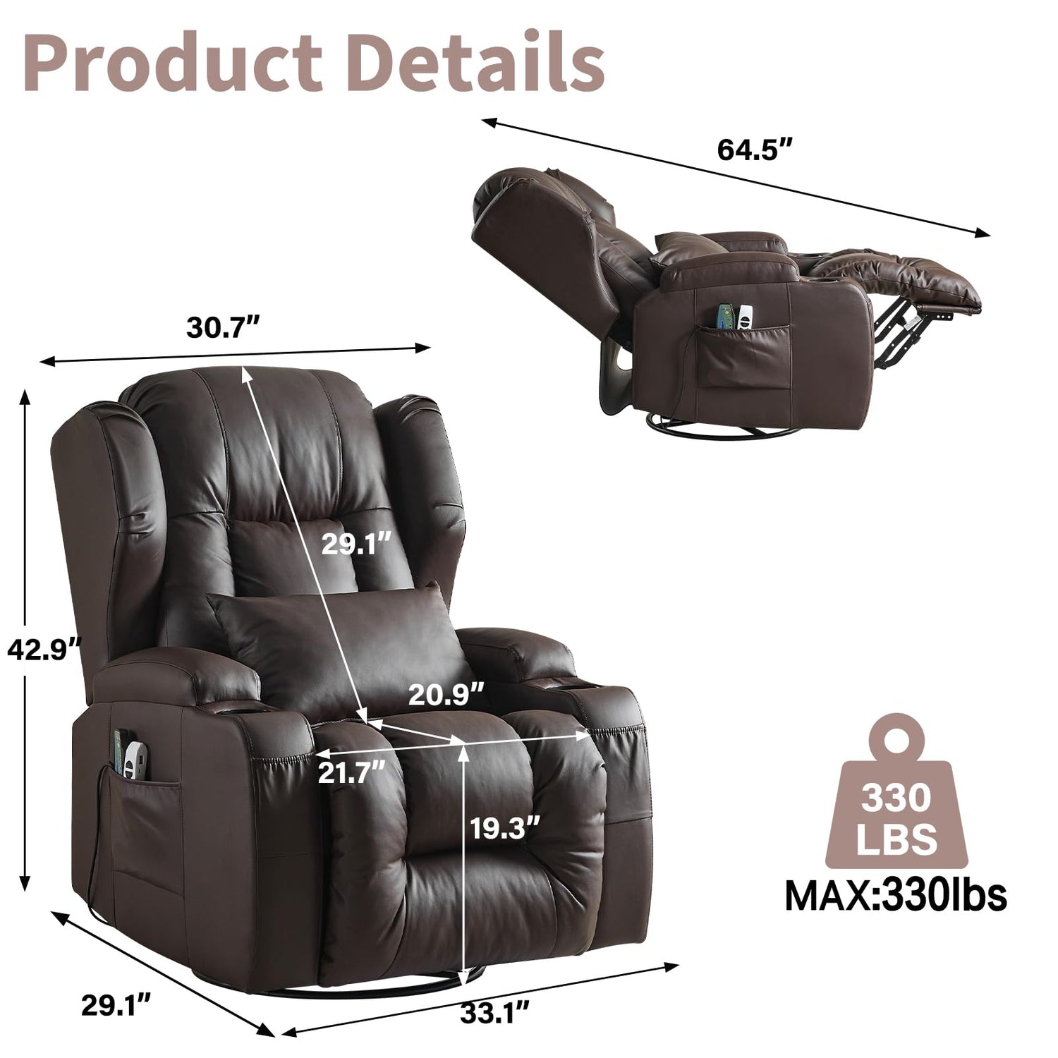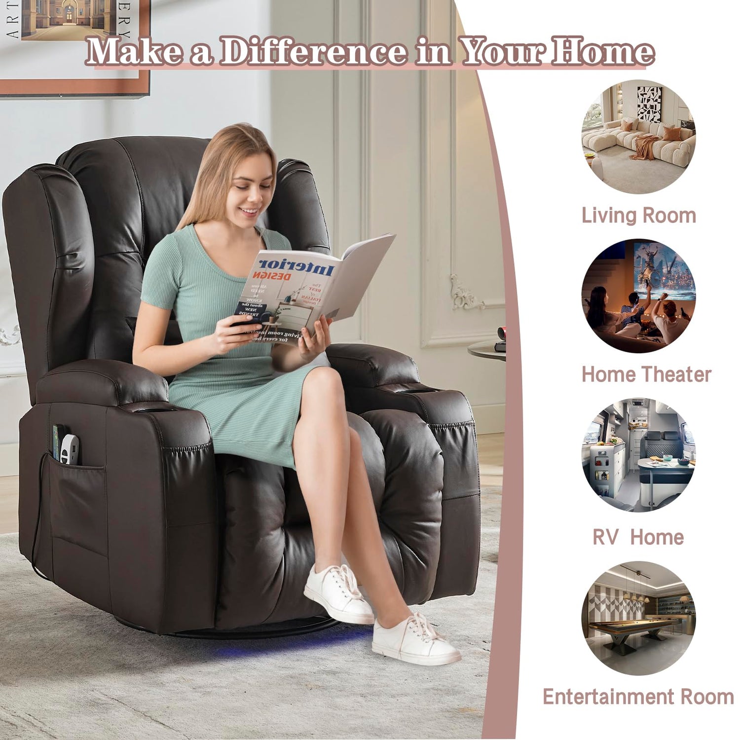 - Comfort for Home and Family:This power recliner chair with heat and massage is designed for living rooms, home theaters, and nurseries. The swivel rocker recliner allows effortless 270° rotation, perfect for parents or relaxing at home