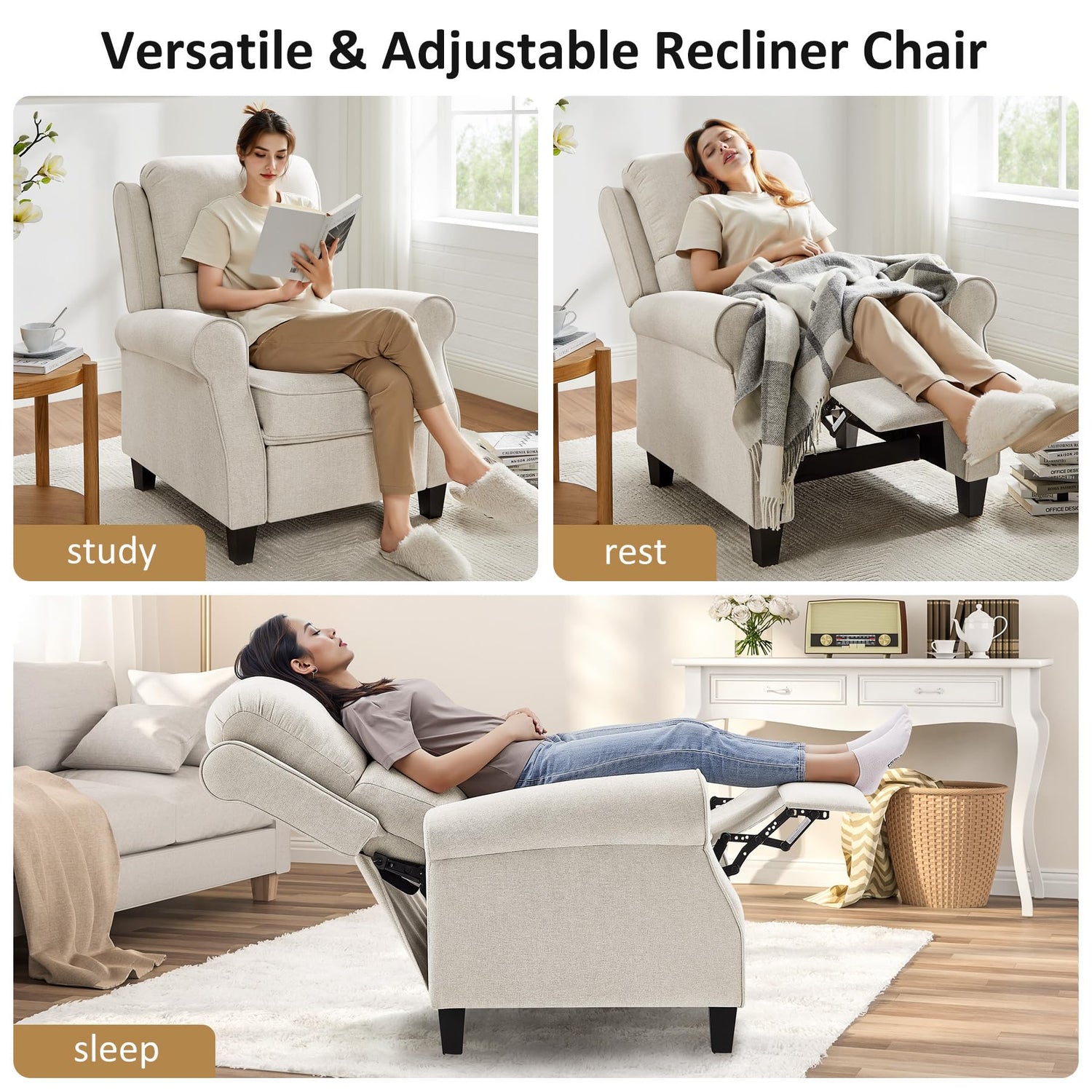 • Breathable Soft Fabric: Sink into the soft embrace of this cloud-like upholstered recliner chair, which is not only skin-friendly but also exudes warmth and comfort. The alternating smooth and ribbed texture of linen fabric gives it a classic, casual appeal. Very suitable as a lazy recliner chair, home movie theater recliner, gaming recliner, comfy reading chairs for adults