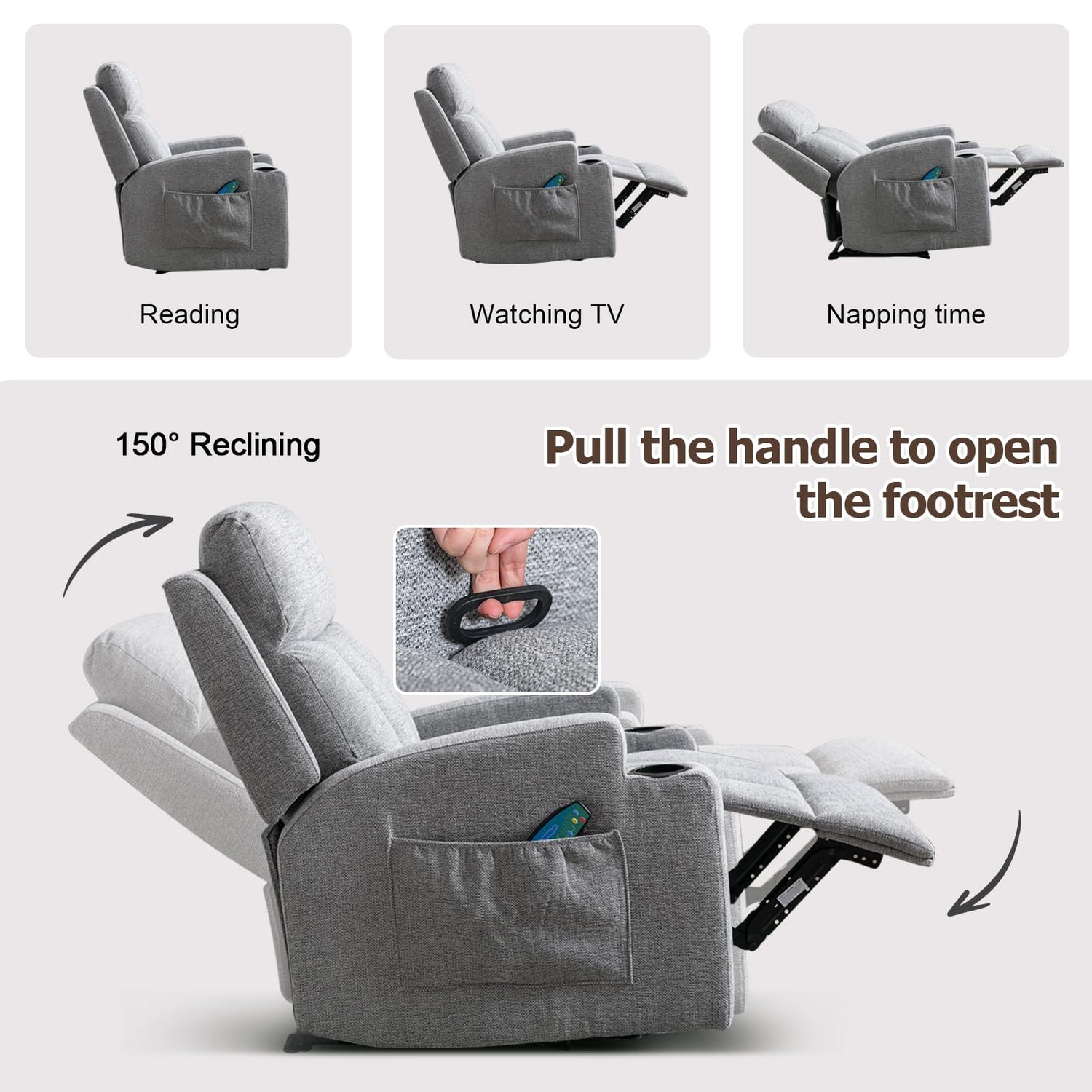 Phoenix Home Manual Recliner Chair with Massage and Heat for Living Room Overstuffed Breathable Fabric Reclining Chair with 2 Side Pockets, 2 Cup Holders, Remote Control, Gray