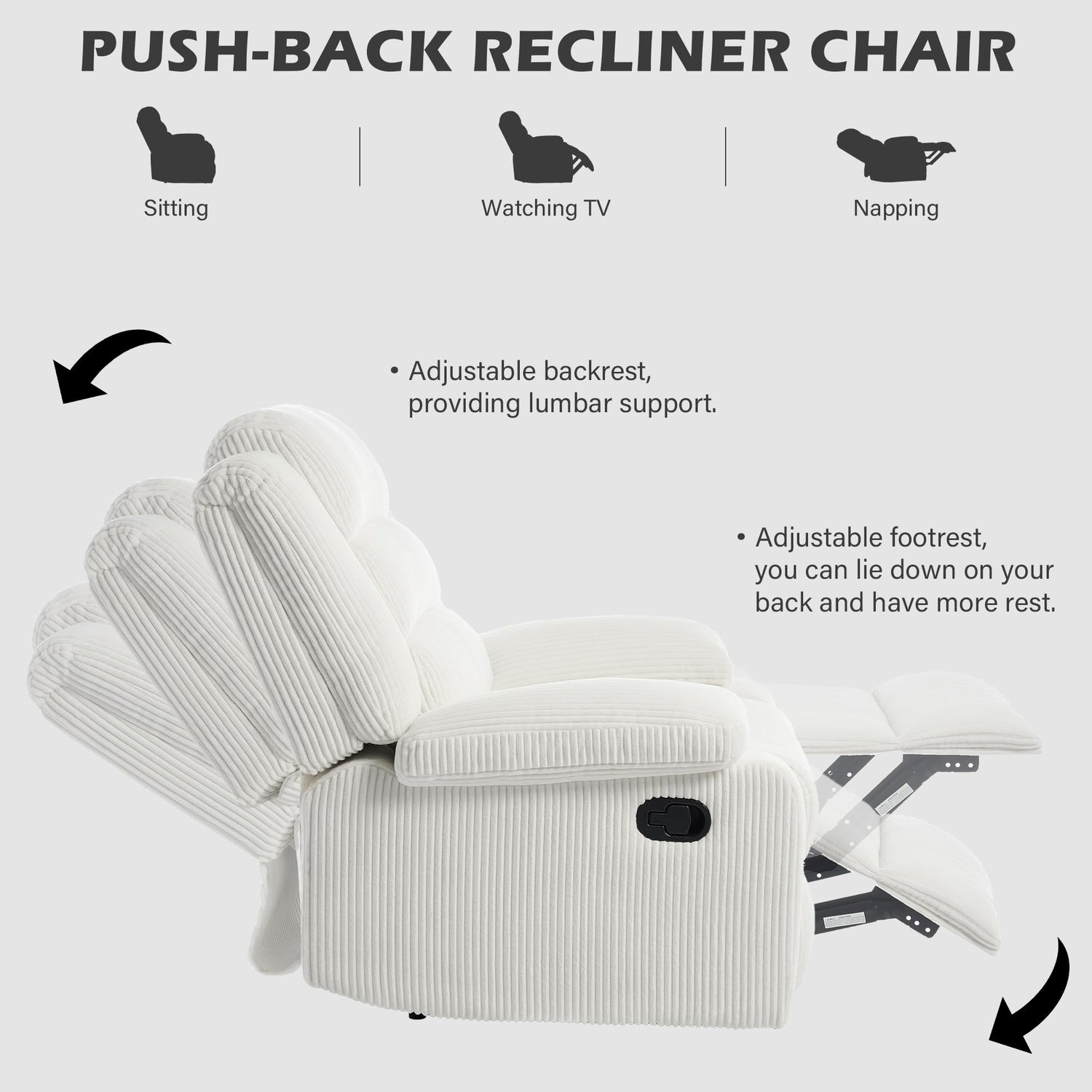 - Versatile and Adjustable Recliner Chair - The backrest can be adjusted for optimal lumbar support, enhancing comfort. And adjustable footrest allows you to kick back and fully relax, perfect for unwinding