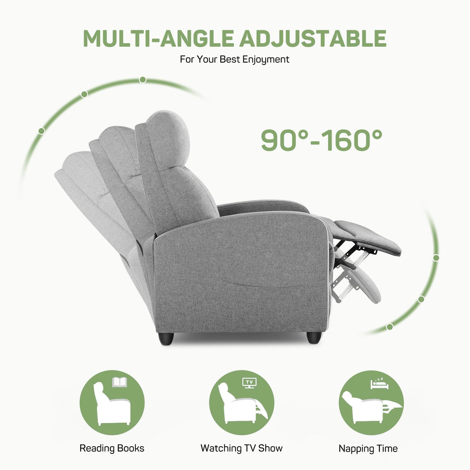 - 【Versatile and Adjustable Recliner Chair】This recliner chair features a dynamic adjustment range from 90 to 160 degrees, allowing you to effortlessly switch between upright seating for reading and a fully reclined position for relaxation. The smooth reclining mechanism makes it a great fit for living room chairs that prioritize both comfort and functionality.