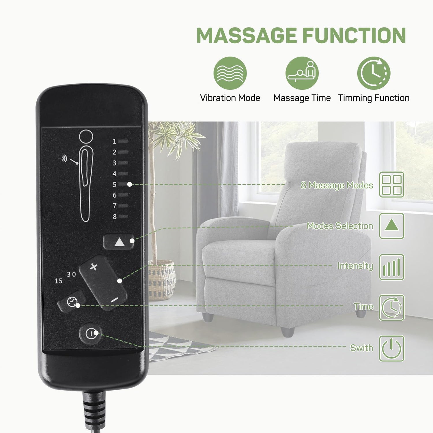 - 【Customizable Comfort for Living Room Chairs】Equipped with 8 distinct massage modes and 2 adjustable vibration settings, this recliner chair is designed to suit a variety of preferences. It combines the luxury of a home spa experience with the practicality of everyday use, making it a standout among living room chairs that offer both style and wellness.