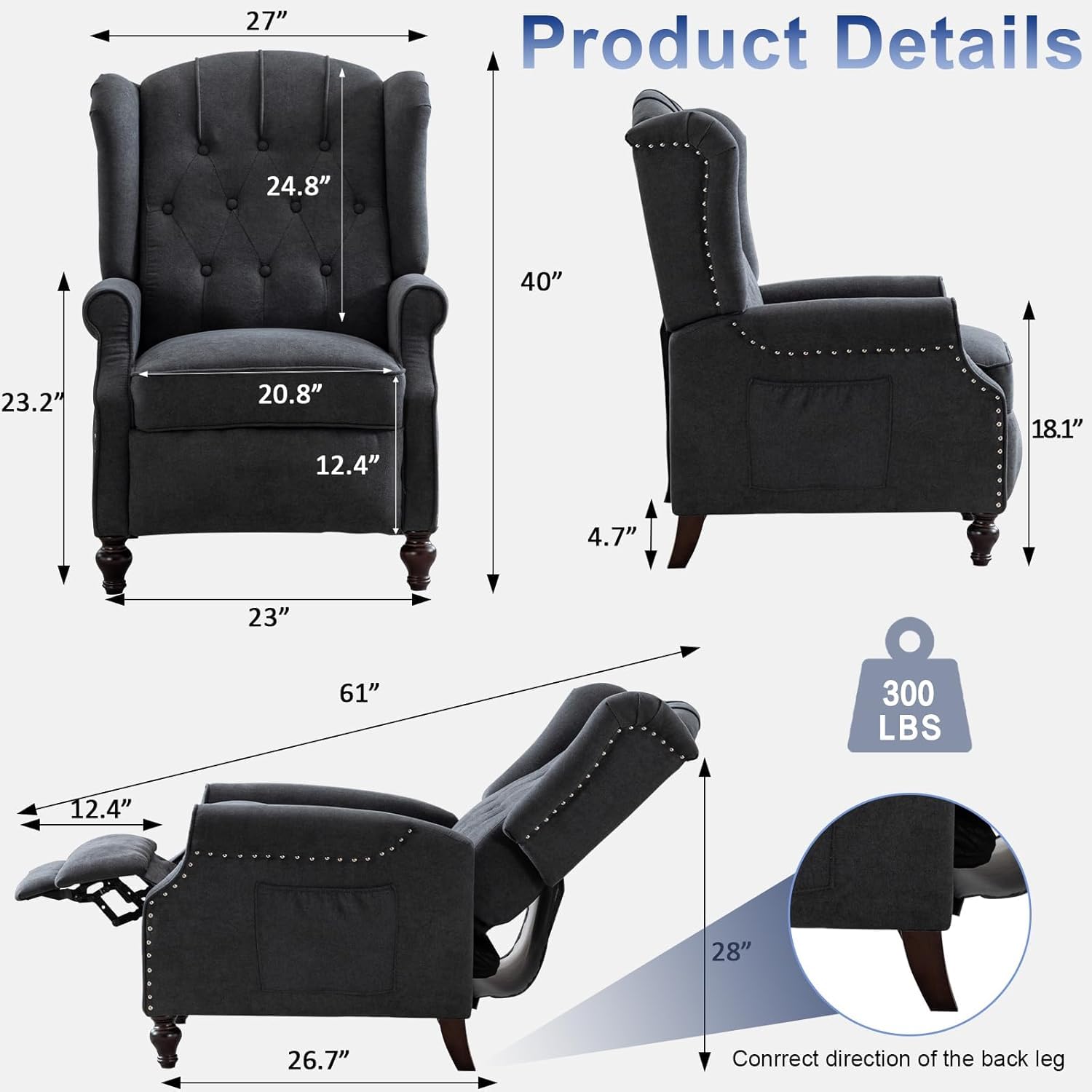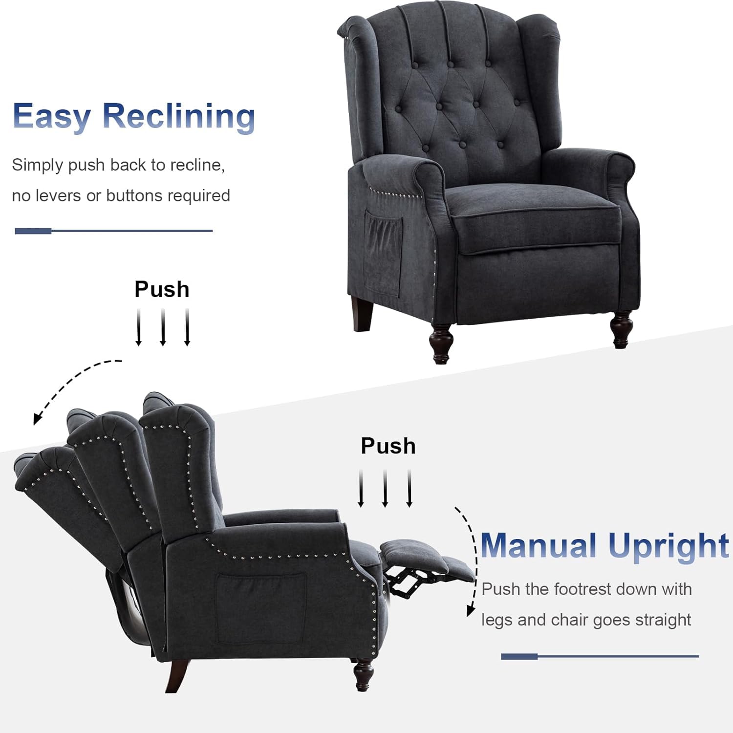 - Modern Design: SAMERY recliner chair features a unique winged back design that complements any decor style. Whether your home style is traditional or modern, this tufted chair seamlessly blends in and adds a touch of fashion to your living space