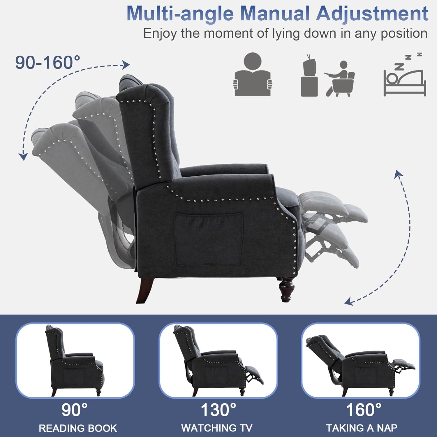 - Quality Service: The manual recliner chair is designed with convenient side pockets for you to conveniently place books, remote controls, or other items. If you encounter any problems or have any questions, please feel free to contact us
