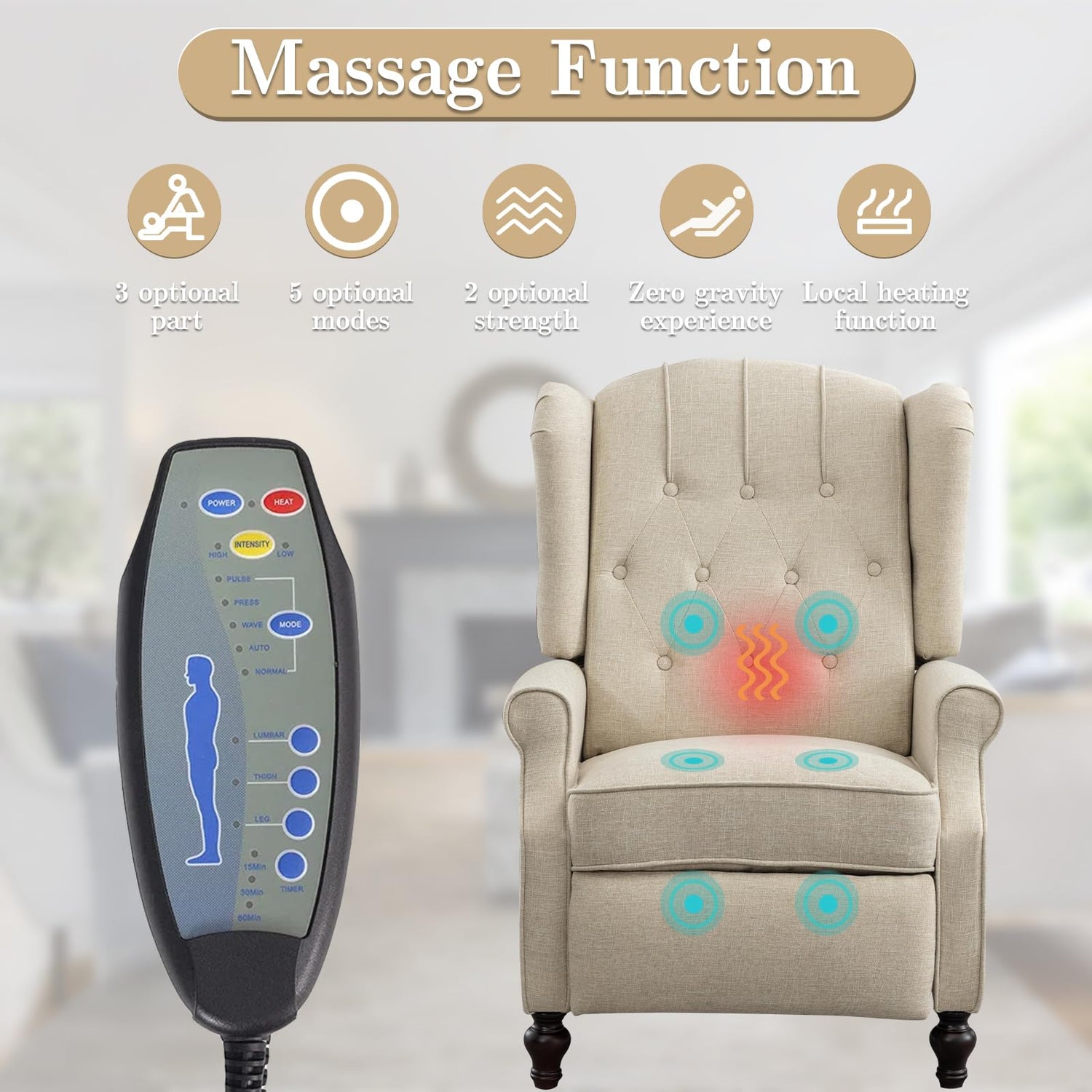 • Massage & Heat: You can customize your preferred vibration massage mode using the remote control. Massage recliner is equipped with 6 vibration modes, 2 lumbar heating points, 5 massage modes and 3 vibration intensities, allowing you to immerse yourself in the comfortable embrace of the Living room chairs and indulge in a gentle hug for the ultimate relaxation experience