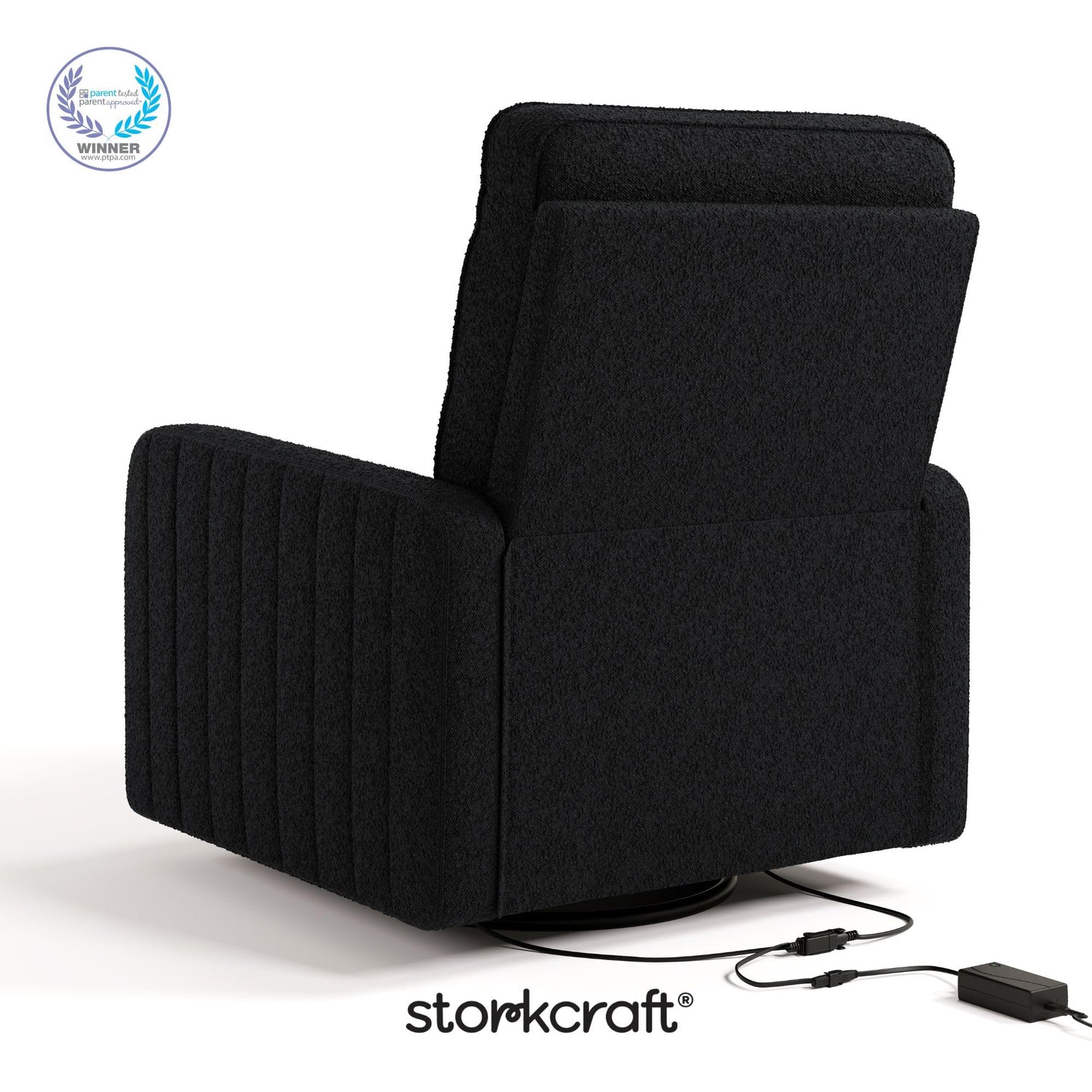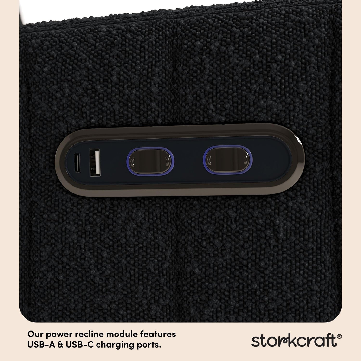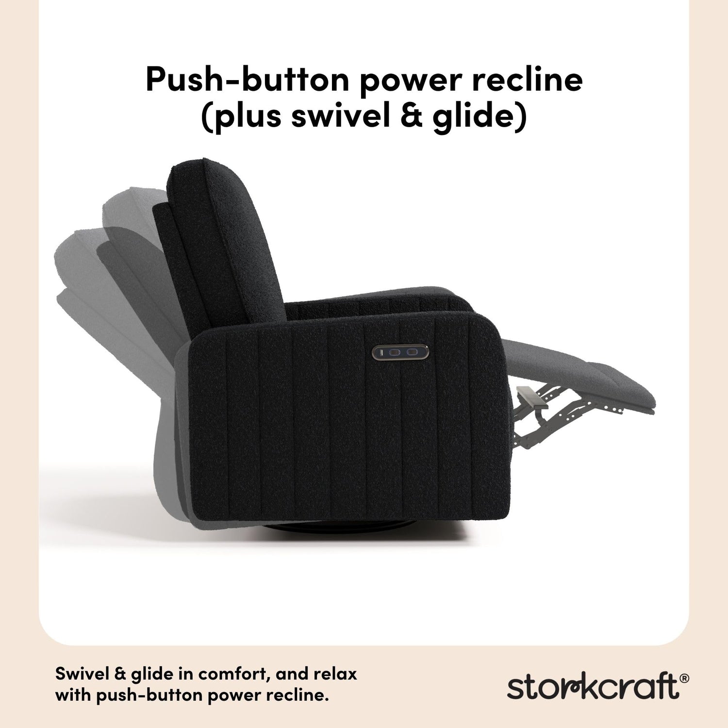 Details: Introducing the elegant and innovative Storkcraft Kyoto Deluxe Extra-Wide Nursery Power Recliner Swivel Glider — part of Storkcraft’s exclusive, ultra-premium “Art of Nursery” Collection. The Kyoto Deluxe Extra-Wide Nursery Power Recliner Swivel Glider embodies the signature elevated designer details of Storkcraft’s premium Kyoto Collection, but in the form of a comfortable, relaxing nursery glider rocking chair — specifically designed for bonding moments with your newborn. The Kyoto’s gorgeous aesthetic is distinctly defined by its vertical channel tufting — adding a dose of designer elegance to your nursery. More than just a nursery glider, the innovative Kyoto includes “push button” electronic power reclining, allowing you to lean back (and sit back up) with the easy push of a button. An extension of the Storkcraft Kyoto Collection, the Kyoto Deluxe Nursery Power Recliner Swivel Glider also includes a dual-USB charging port – equipped with both a USB-A and USB-C charging port to keep your smartphone, tablet, or e-reader charged, so you can focus on your baby. An original Storkcraft design, the Kyoto is exclusively manufactured by Storkcraft — North America’s longest-standing name in cribs, since 1945. The Kyoto is backed by Storkcraft’s one-year limited manufacturer’s warranty and supportive, real-life Customer Care team. Easy Assembly required. Power source (wall outlet) required. An exclusive, in-house, Storkcraft original design — and part of Storkcraft's flagship Art of Nursery Collection. For a standard-sized experience, discover the Storkcraft Kyoto Deluxe Nursery Power Recliner Swivel Glider. Crafted with love, since 1945.
