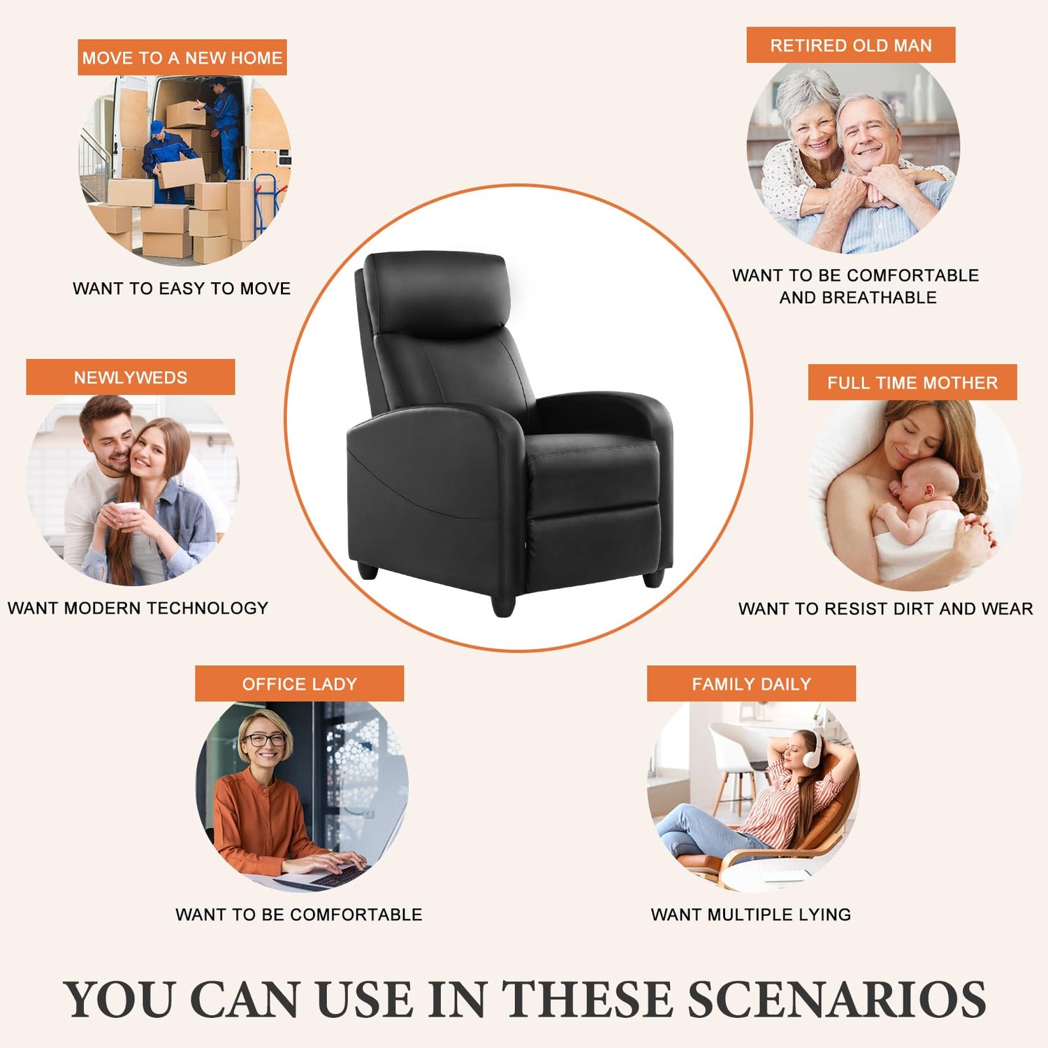 - 【Premium Quality for Maximum Comfort】Crafted with high-quality fabrics and filled with a high-resilience sponge, this recliner offers superior comfort and breathability. The sturdy hardwood frame ensures long-lasting durability and reliable stability, while the ergonomic design provides fatigue-free sitting even for extended periods.