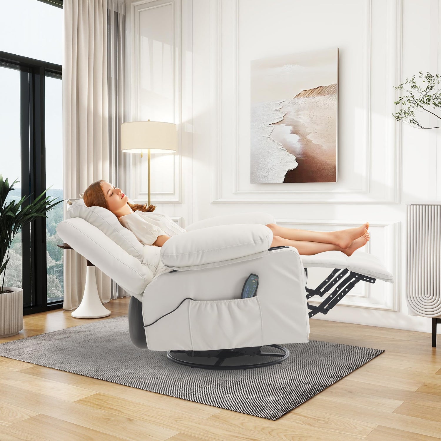 Swivel Rocker Recliner with Massage & Heat, Overstuffed Faux Leather Recliners Modern Chair for Living Room, Single Sofa Rocking Chairs for Adults, Manual Rocker Recliner with Cup Holders, White