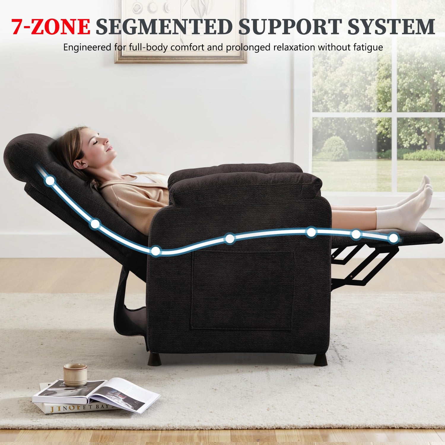 • 7-Zone Full-Body Support System: Engineered for ergonomic comfort, this electric recliner provides 7-zone segmented cushioning that conforms to your body’s natural curves, supporting the head, back, lumbar, hips, thighs, calves, and feet for balanced relaxation.