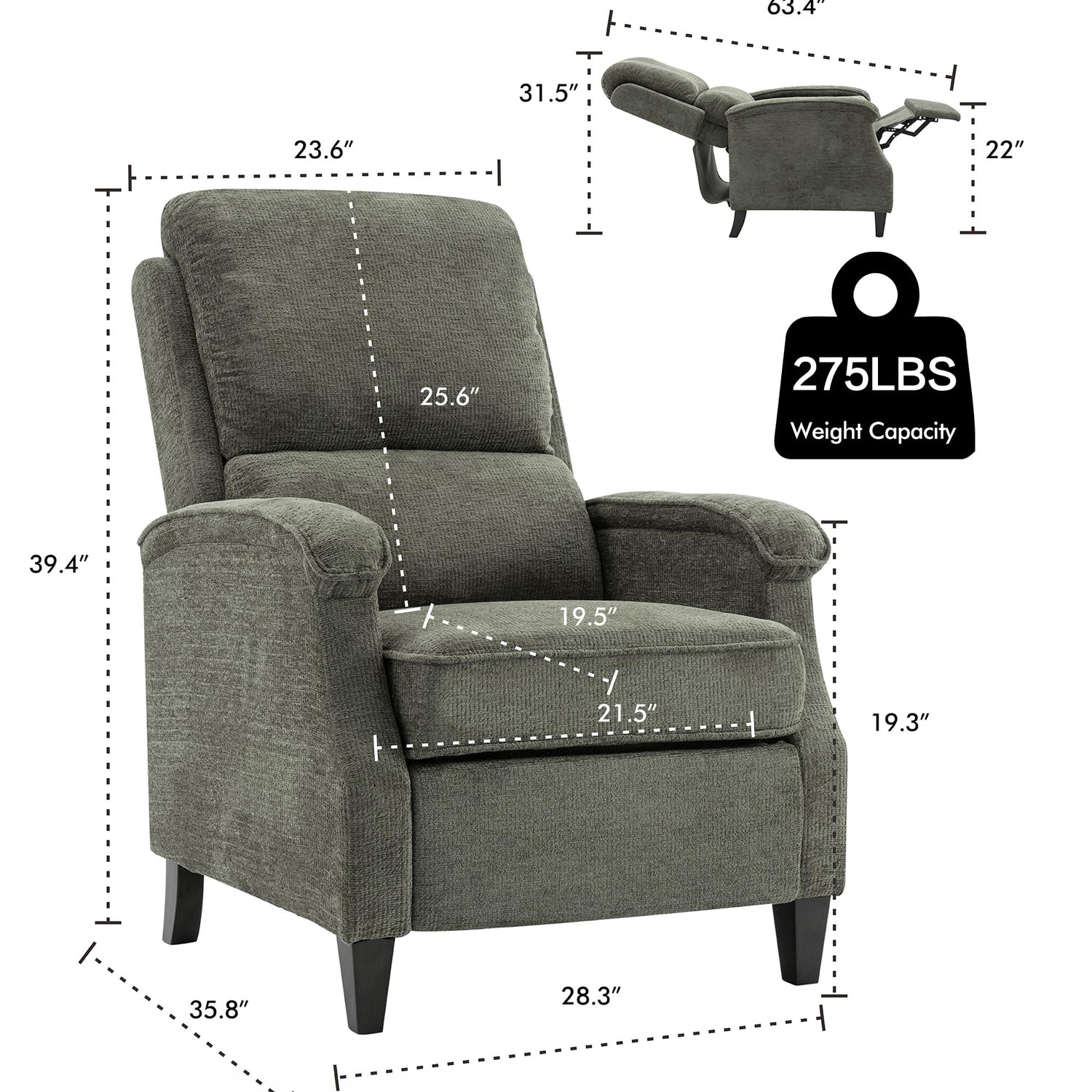 - Size: Overall size:28.3" W × 35.8" D × 39.4" H. This single recliner sofa can afford up to 275 lb. The compact size makes it ideal for any living space.