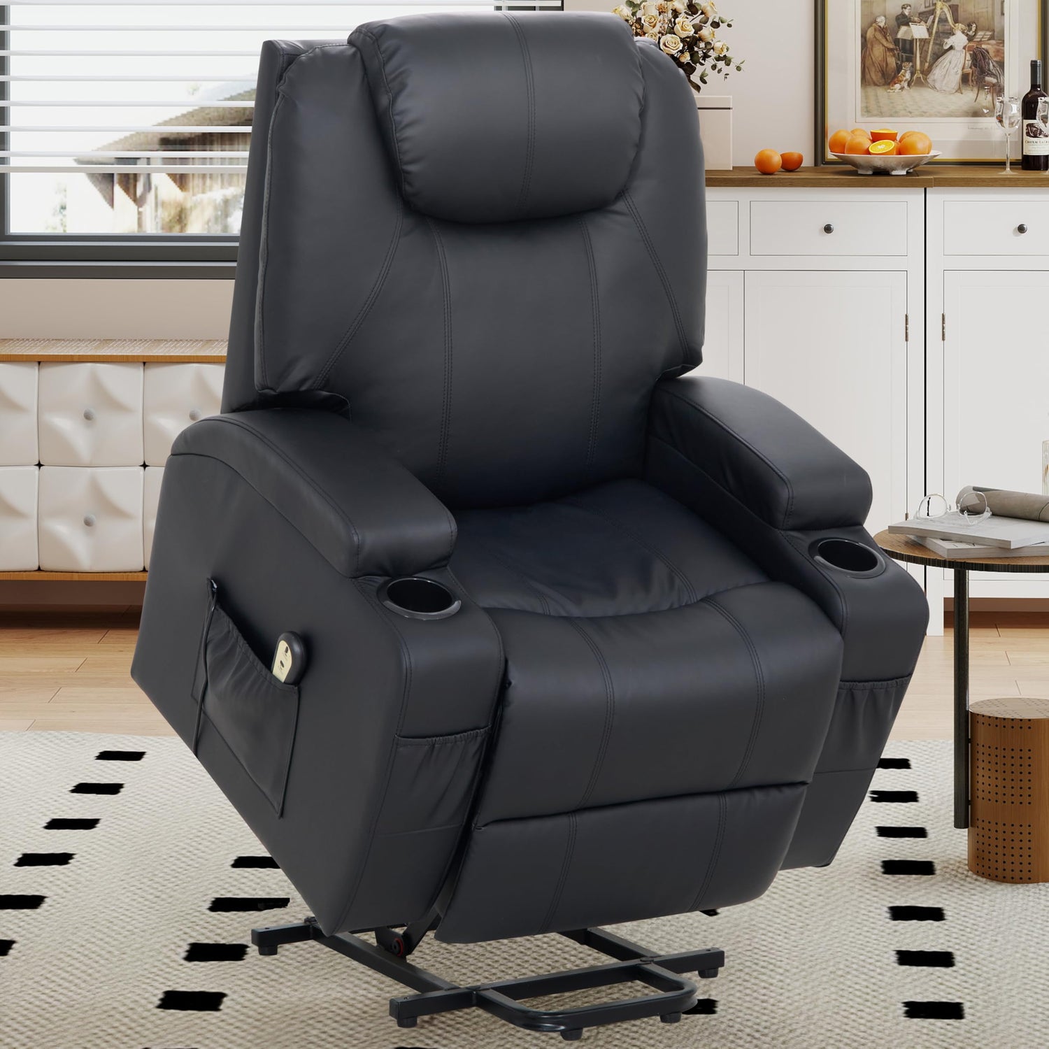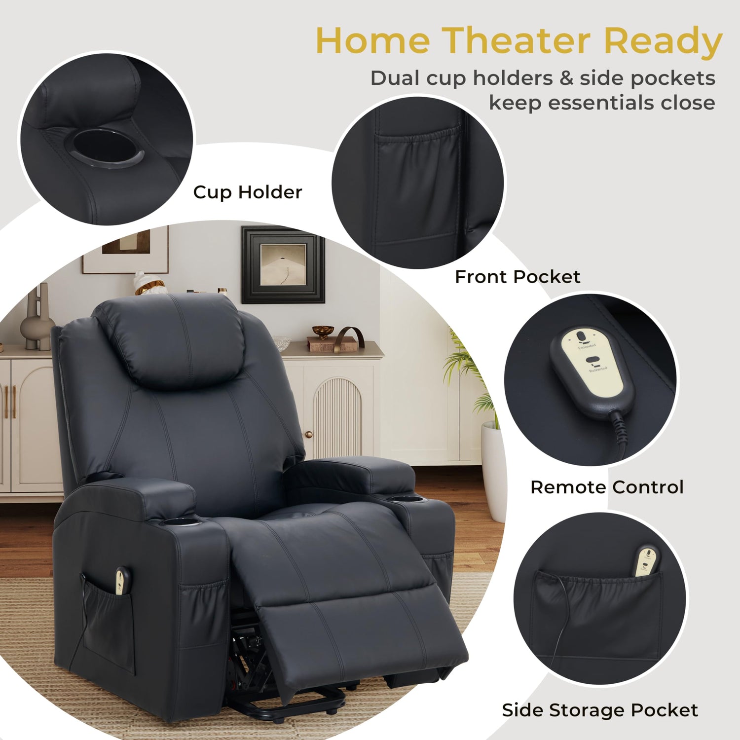 VUOVUS Power Lift Recliner Chair for Elderly, PU Leather Electric Lift Chair with Remote Control, Adjustable Footrest & Lumbar Support, Living Room Recliner with Cup Holders & Side Pockets (Black)