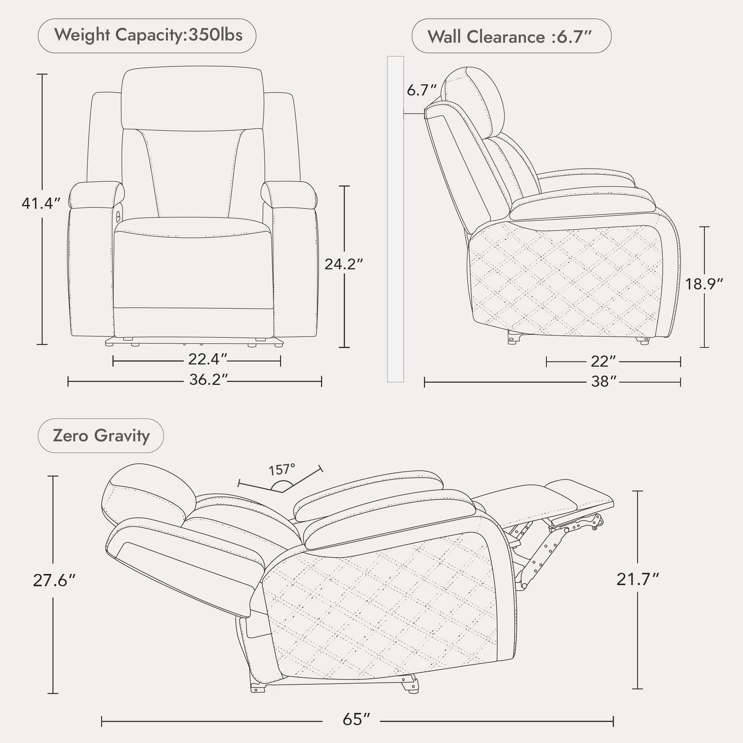 - Sturdy Construction & Certified Materials: The large recliner chair frame is built from durable engineered wood and filled with high-density foam for comfort and support. The premium metal reclining mechanism, with a UL-certified actuator, offers smooth, quiet reclining at the push of a button. Overall Dimensions:38''D x 36.2'W x 41.4''H. Weight Capacity: 350 lbs