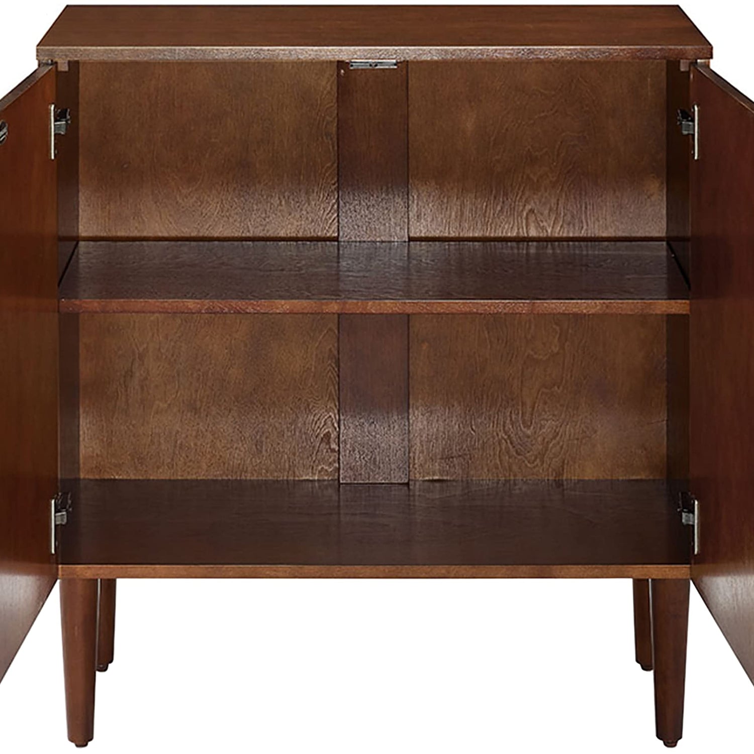 Details: The Everett Console Cabinet from Crosley Furniture is the perfect solution to your small space storage needs. The mid-century modern design compliments the rest of the Everett collection or can stand alone to add a touch of classic design to your decor. Tucked behind the doors is one adjustable shelf for storage while the exterior features round tapered legs, genuine metal hardware and a hand rubbed mahogany finish. Place this in your foyer for a convenient, stylish entryway piece, use in a narrow hallway or slip into a small corner. The options are endless.