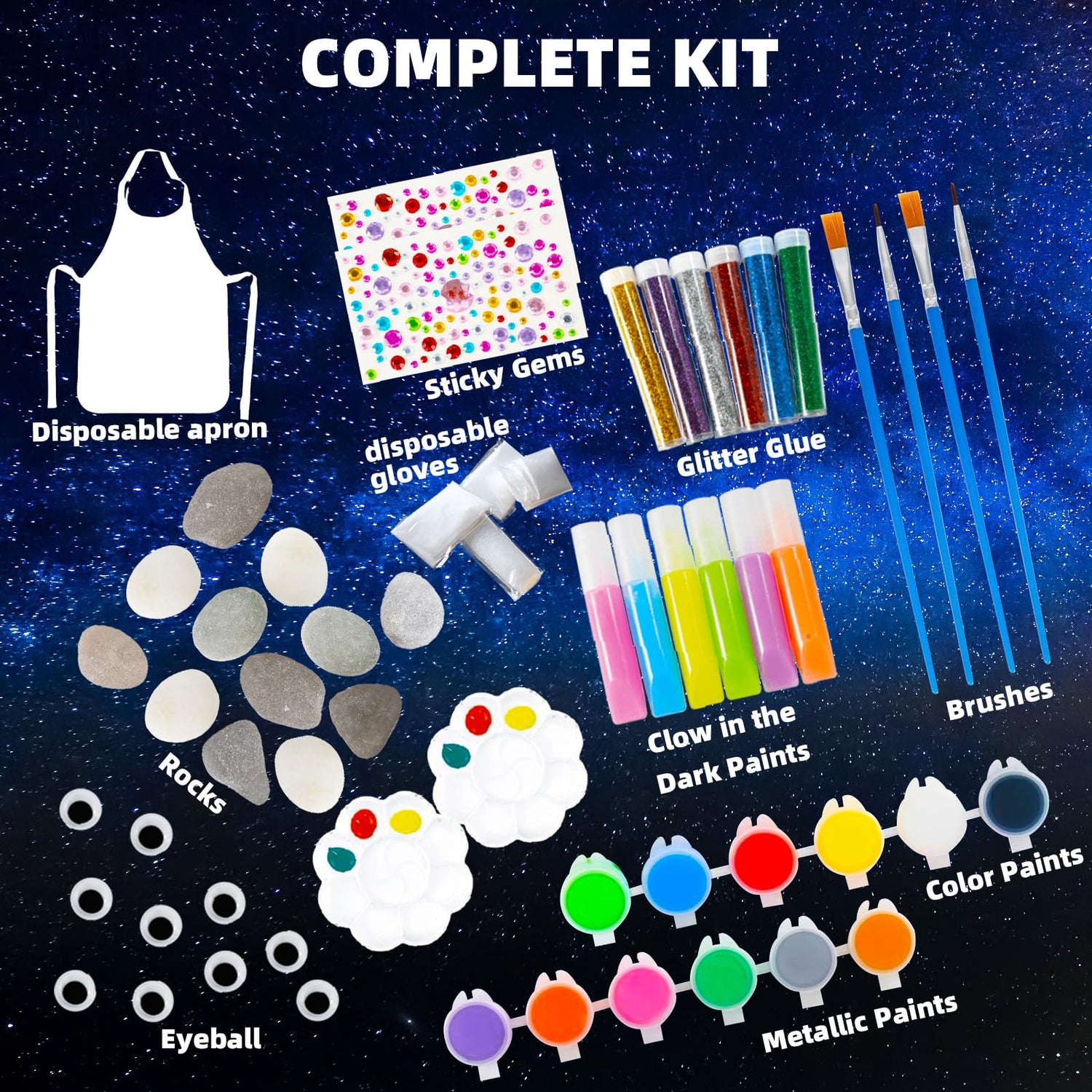 • PACKAGE INCLUDES: This rock making kit includes 4 natural white river rocks, 8 normal gray rocks, 12 craft paint tubs, 6 3d glow paints, 4 paint brushes, 6 glitters, 10 gloogly eyes, 2 color tray, 2 sheet gems stickers, 4 disposable gloves, 2 disposable apron, 1 disposable tablecloths.