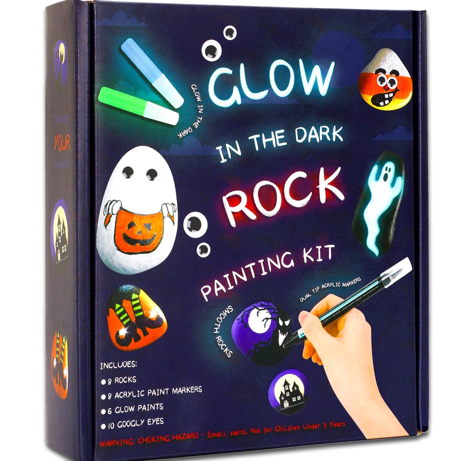 - ARTS & CRAFTS KITS - This glow in the dark rock painting set includes, 8 smooth rocks, 8 mess-free paint markers, 6 glow in the dark paints, 10 googly eyes and 1 instruction. It allows kids and teens to express themselves through vibrant designs inspired by their favorite animals, planets, and more. Enjoy the ultimate Halloween paint activity!