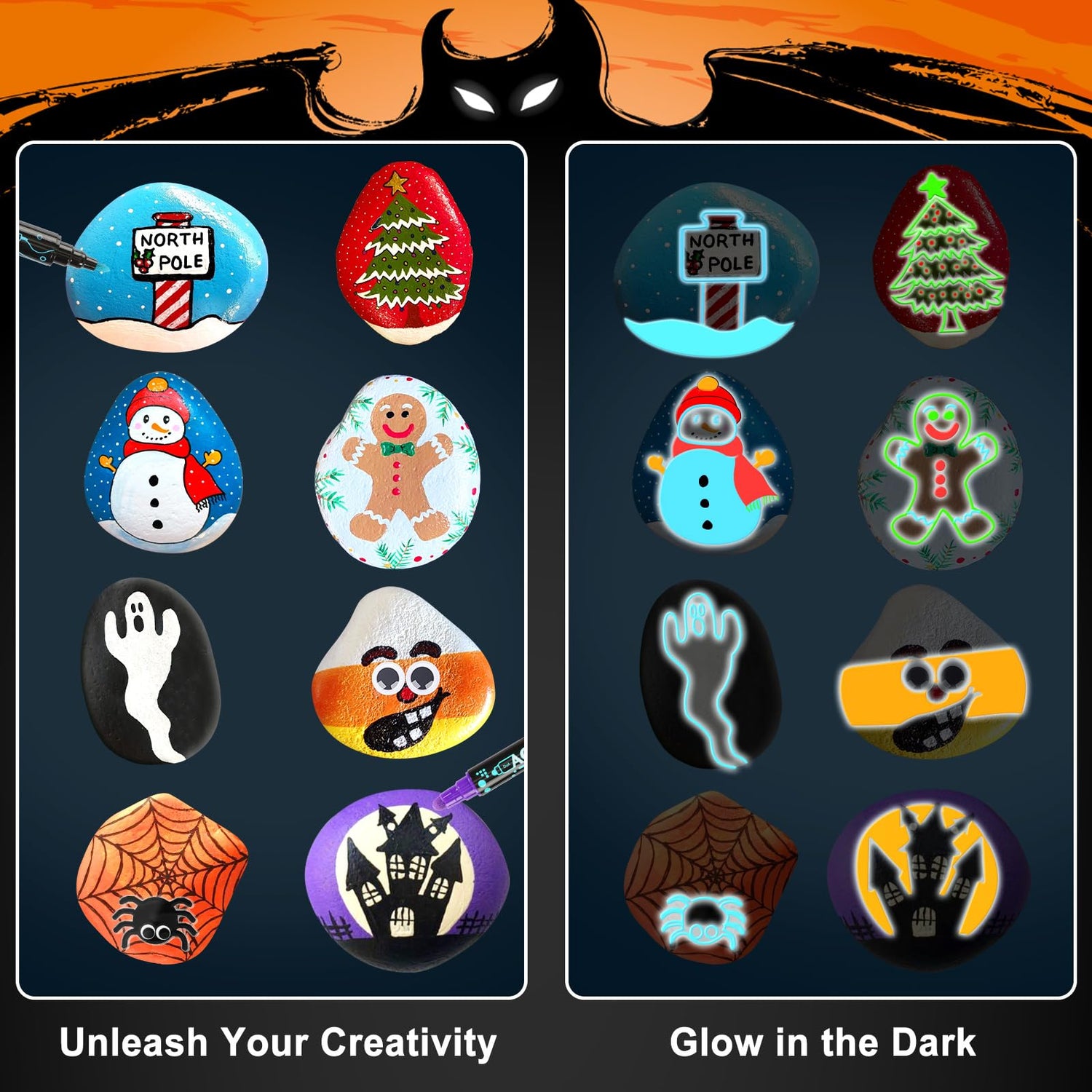 - GLOW IN THE DARK ROCK PAINTING KITS - Bring your Halloween creations to life with 6 glow in the dark paints - pink, orange, yellow, green, blue and white. After absorbing enough light during the day, these paints make your rock art glow in the dark, adding an extra layer of fun as you play hide-and-seek games at night.