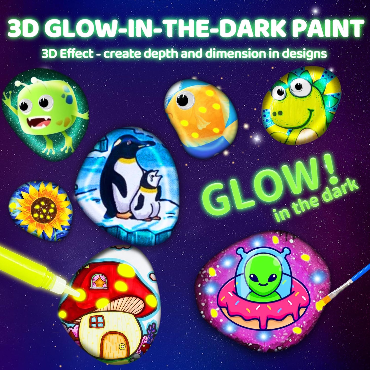- Glow in The Dark: Make rocks come alive under the night sky, allowing children continue to enjoy the fun of painting at night and become a dazzling decoration on Christmas Eve. The glow-in-the-dark pigments ignites a world of wonder, making every piece a nocturnal spectacle.